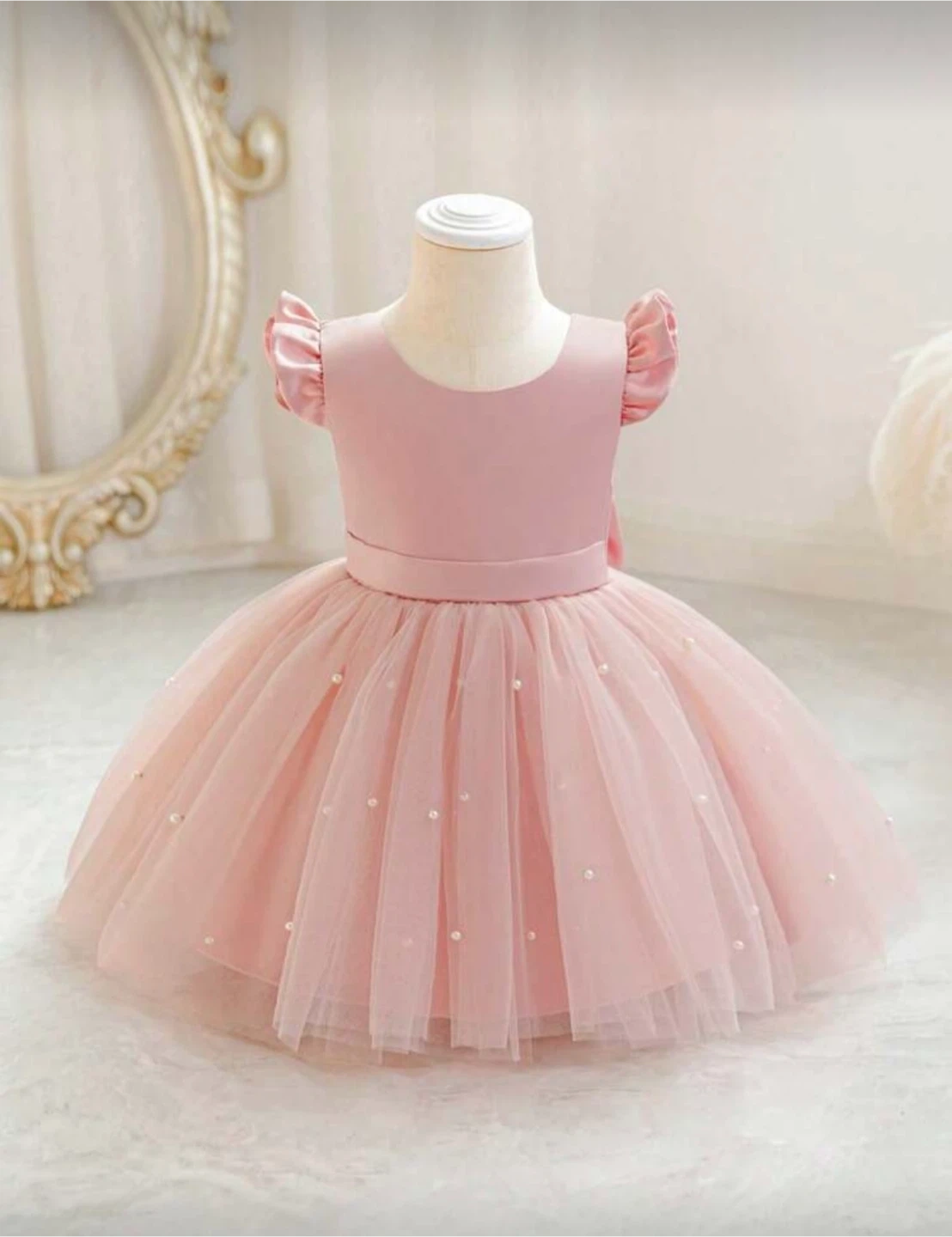 Adorable pink tulle dress, perfect for a flower girl or special occasion! This was only used ONCE for a photoshoot and size is 18 months. The dress features a satin bodice and a full, layered tulle skirt with delicate pearl accents. The back has a beautiful bow detail. It's in excellent condition and ready for its next event!