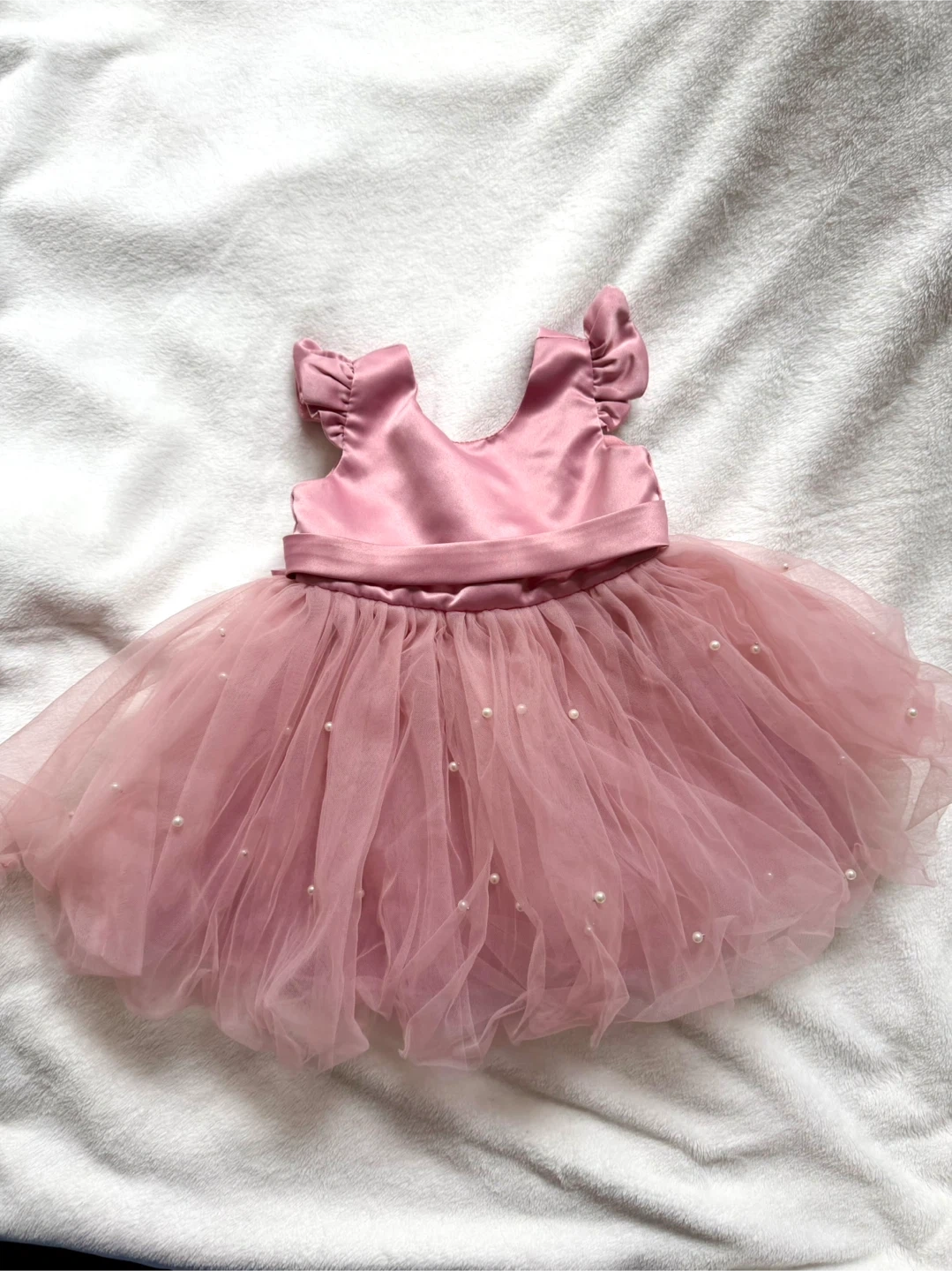 Adorable pink tulle dress, perfect for a flower girl or special occasion! This was only used ONCE for a photoshoot and size is 18 months. The dress features a satin bodice and a full, layered tulle skirt with delicate pearl accents. The back has a beautiful bow detail. It's in excellent condition and ready for its next event!
