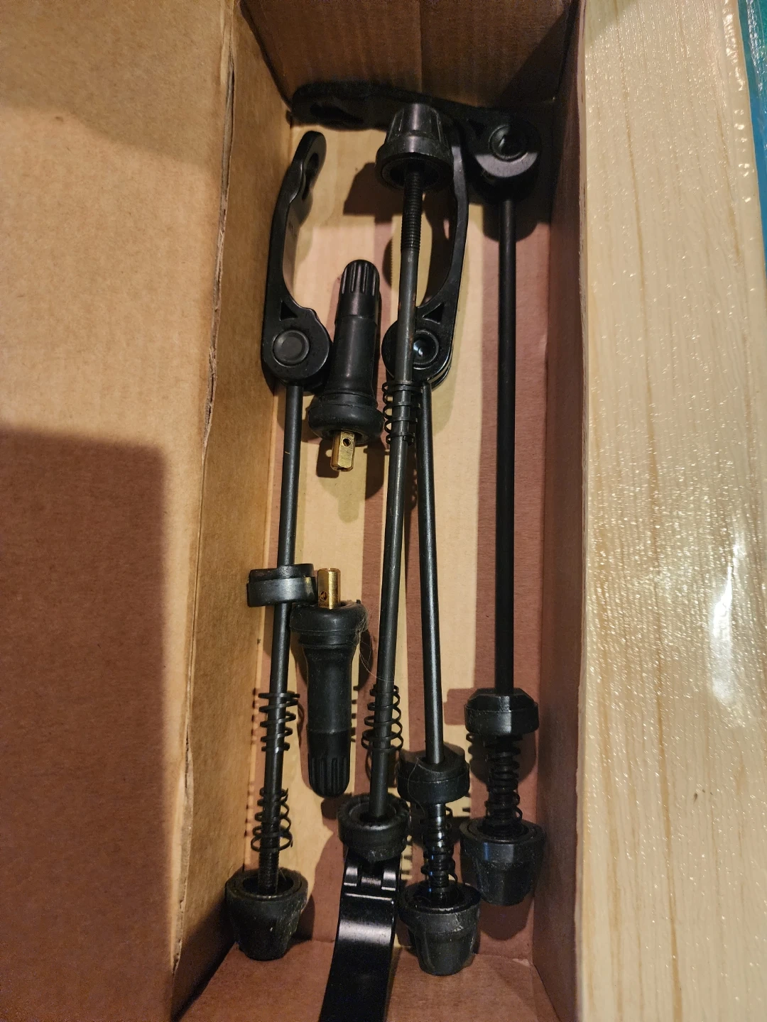 Selling a set of bike quick release skewers and valve extenders! They come in their original box. Perfect for upgrading your bike or replacing worn parts