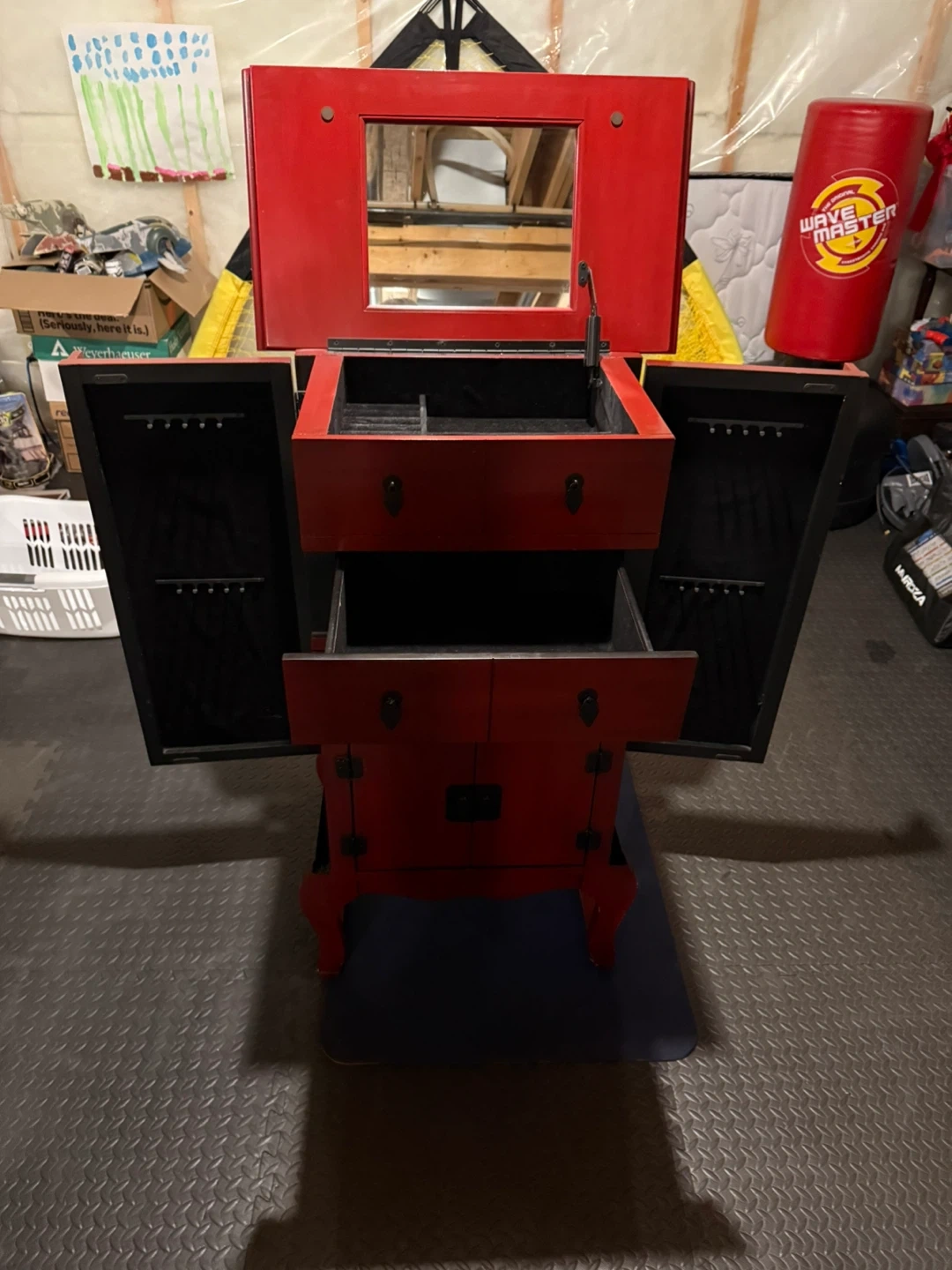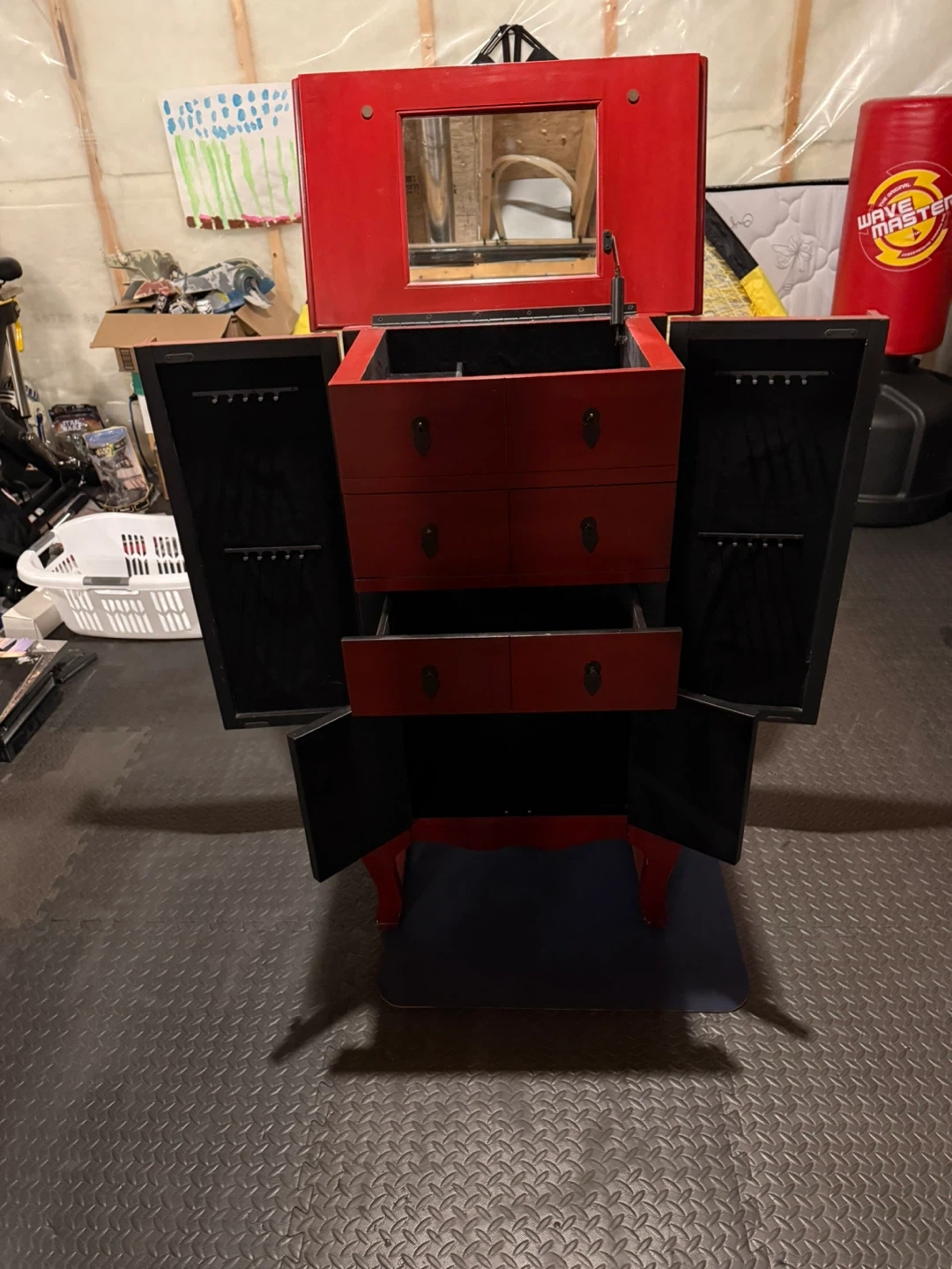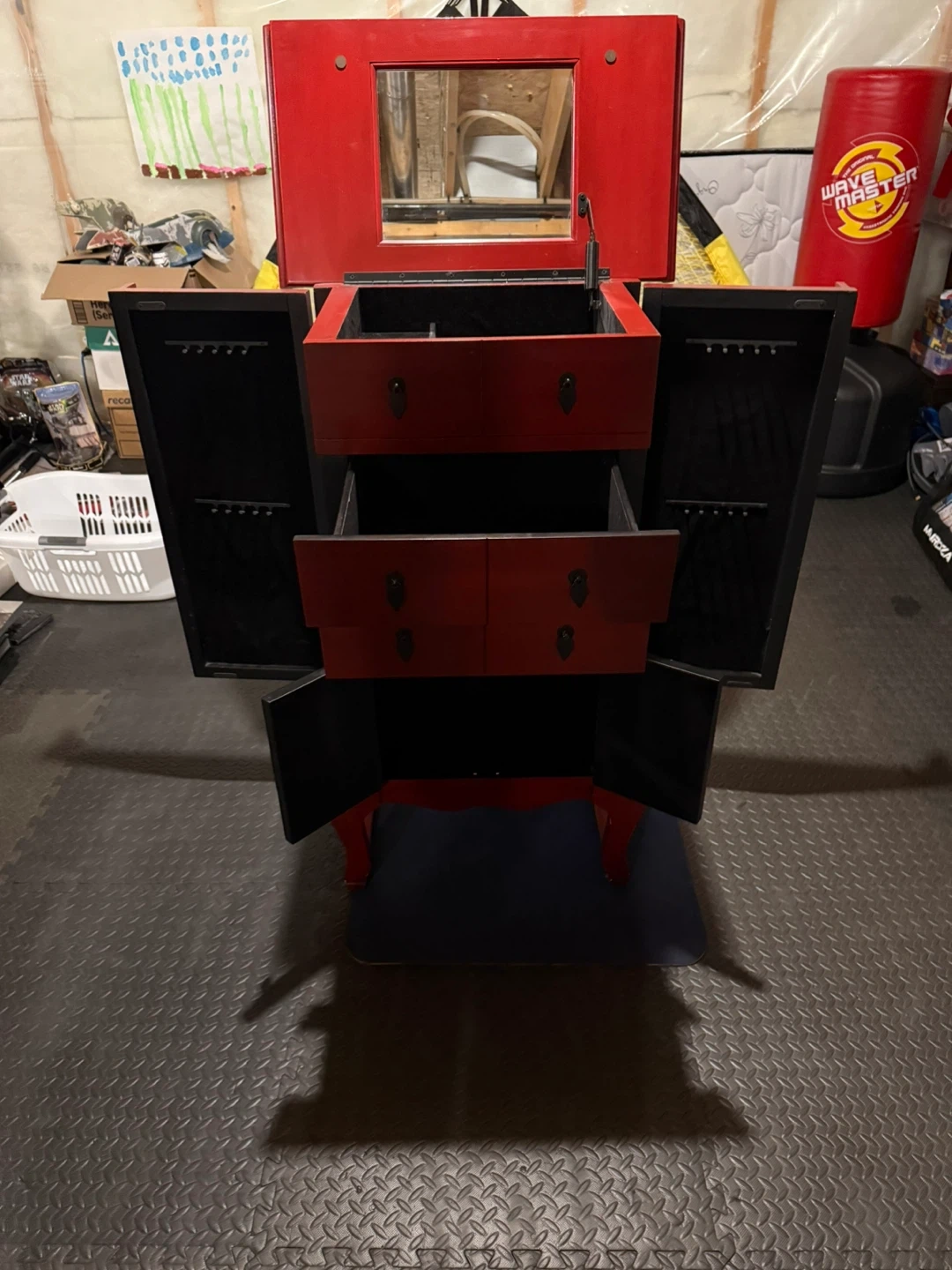 Selling a red jewelry armoire cabinet. It features multiple drawers and compartments, including side doors with hooks for necklaces and a top compartment with a mirror. The interior is lined with a soft, dark fabric, perfect for keeping your jewelry organized and protected