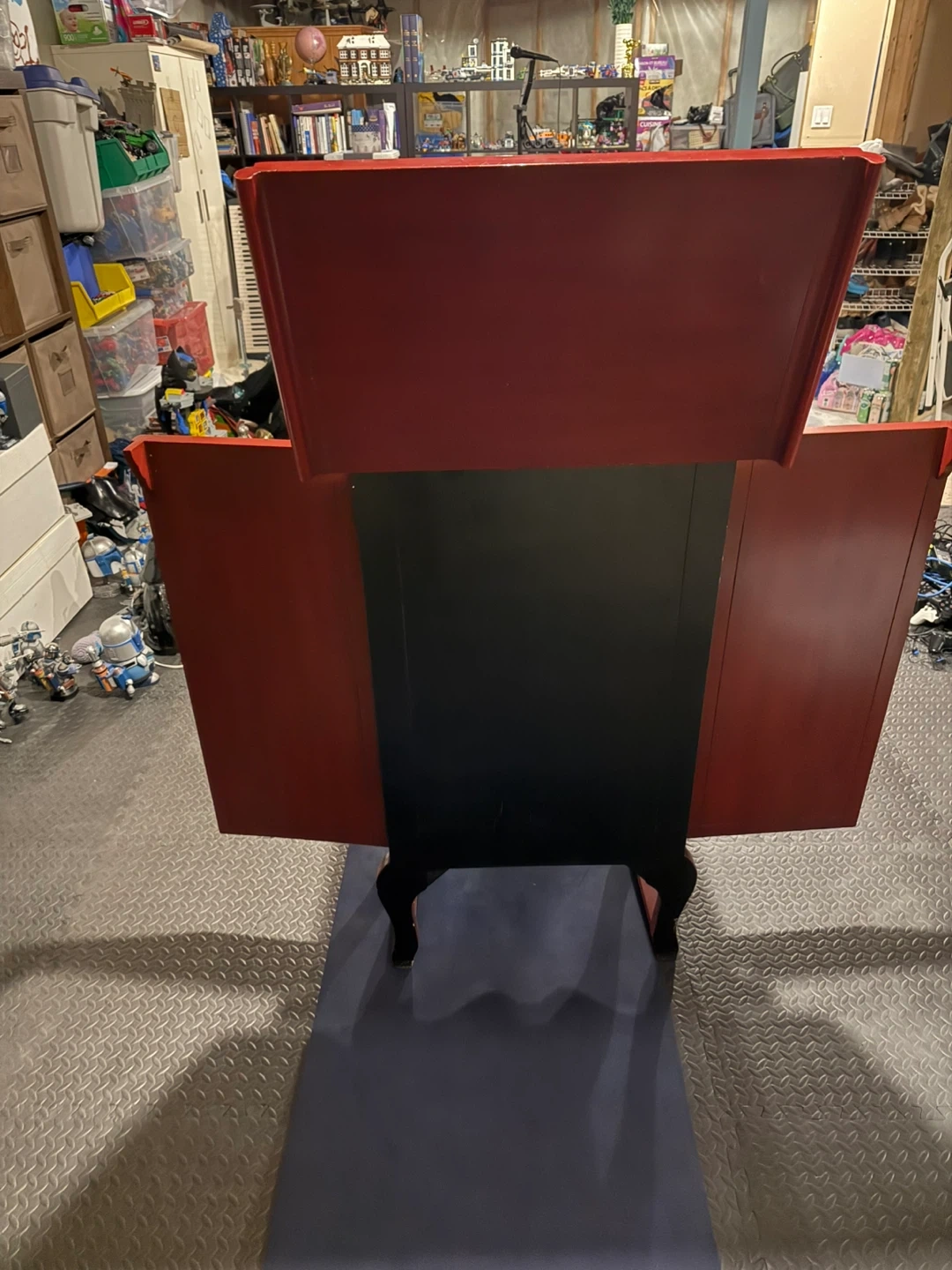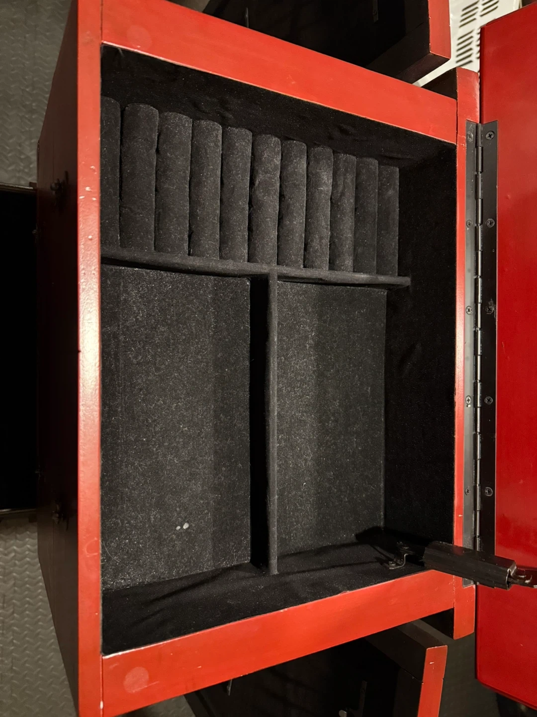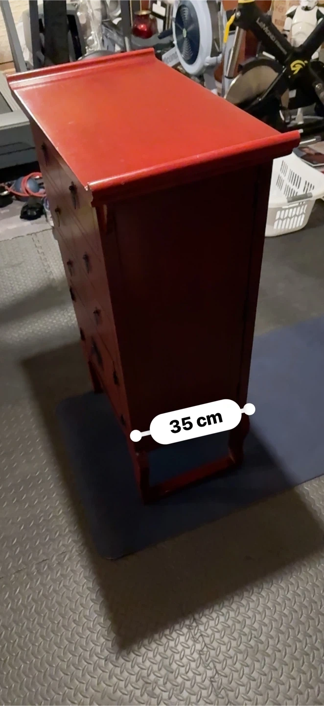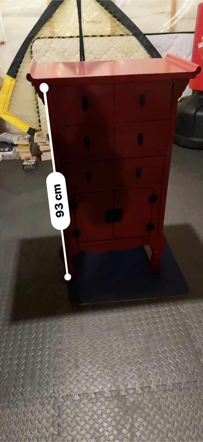 Selling a red jewelry armoire cabinet. It features multiple drawers and compartments, including side doors with hooks for necklaces and a top compartment with a mirror. The interior is lined with a soft, dark fabric, perfect for keeping your jewelry organized and protected