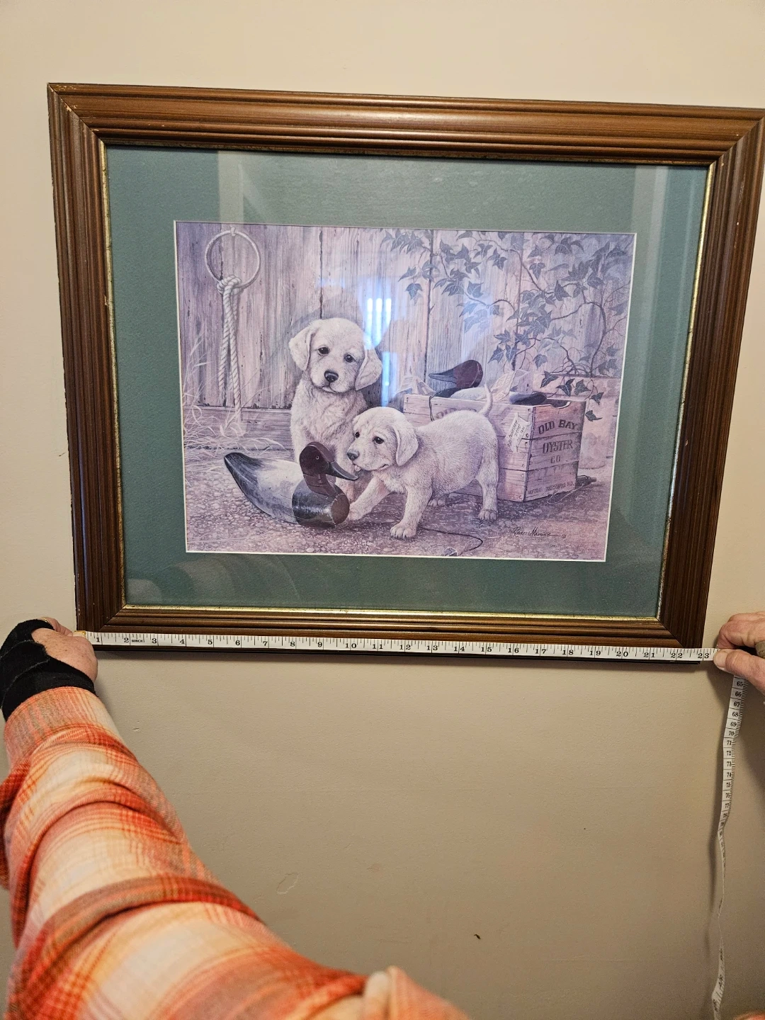Framed print featuring adorable puppies with a duck. The frame measures approximately 22 inches in height and 24 inches in width. It's a charming piece to add to any room!