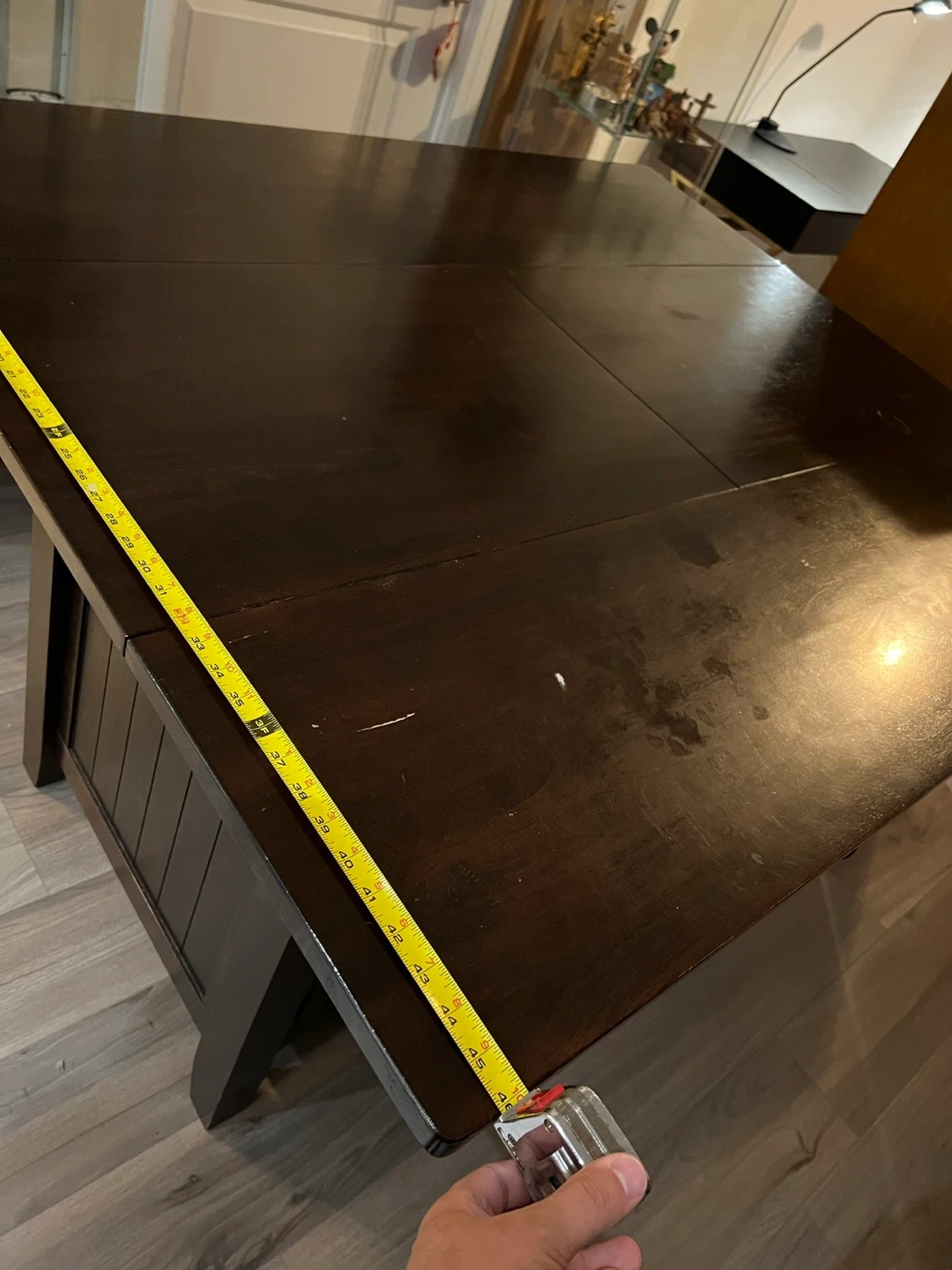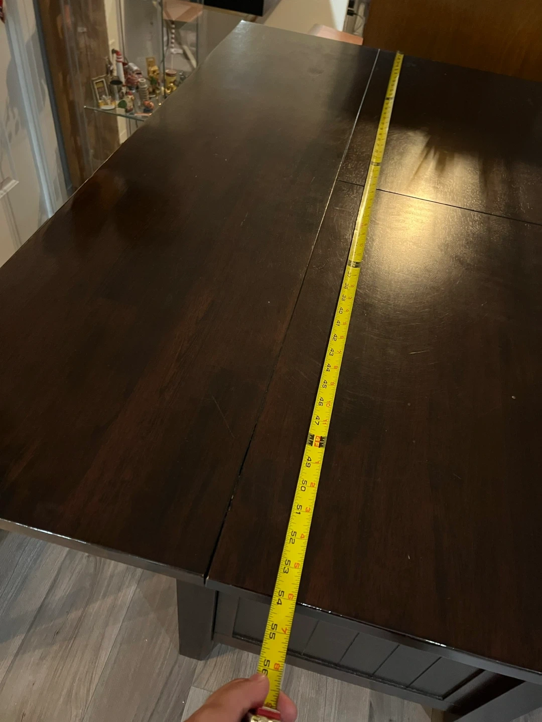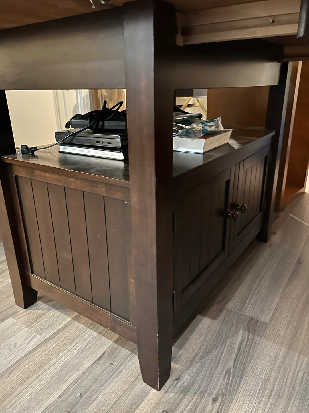 Selling a solid dark brown wood dining table. It's in good condition and has a nice, sturdy feel. The table measures approximately 54 inches in length and 30 inches in width. It also features a convenient storage cabinet underneath for extra space. No chairs.
