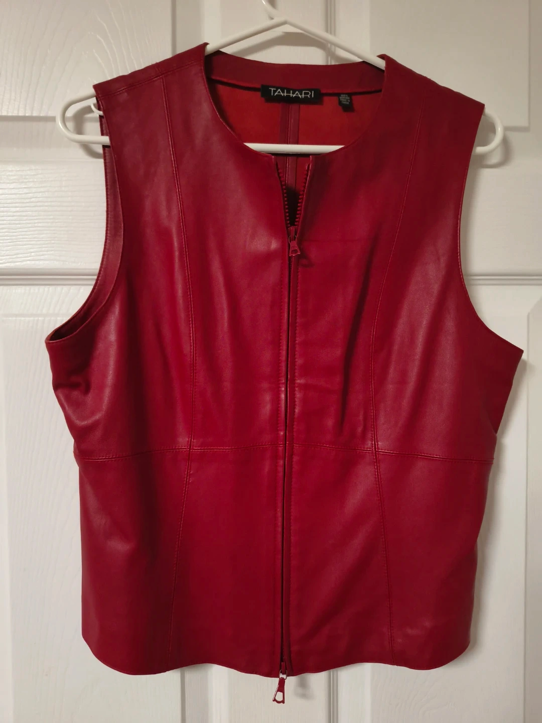 Selling a vibrant red leather vest from Tahari! It features a sleek, sleeveless design with a front zipper closure. Perfect for adding a pop of colour and a touch of edgy style to your wardrobe