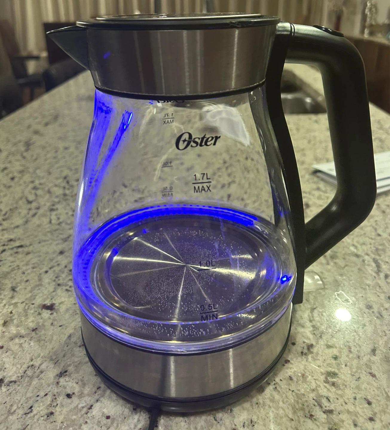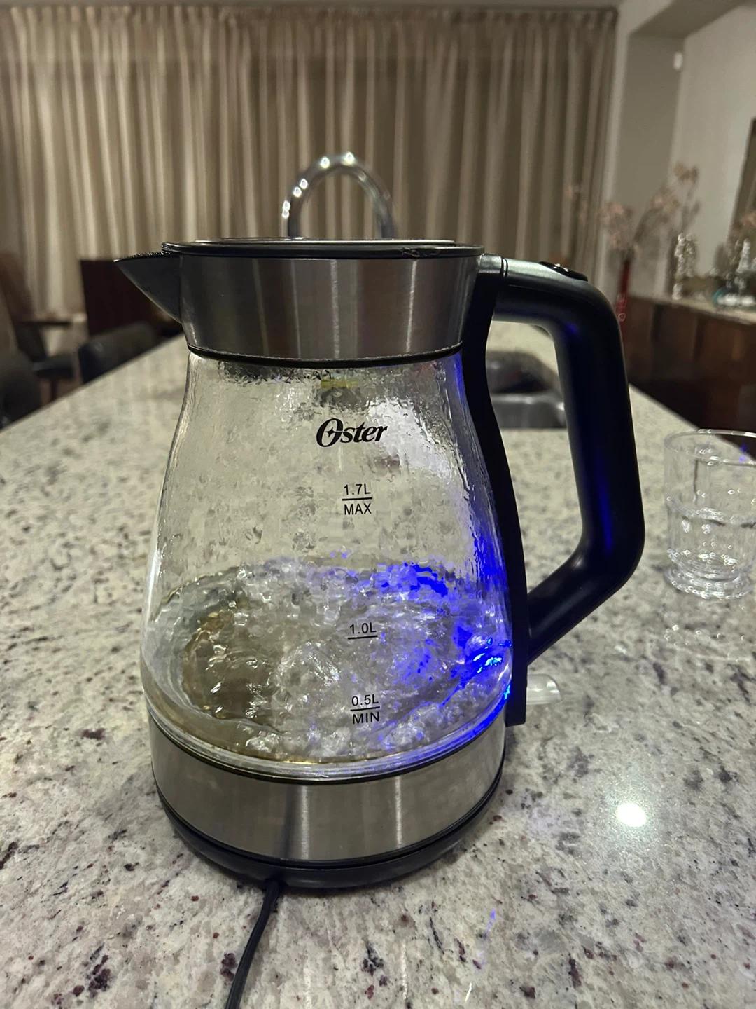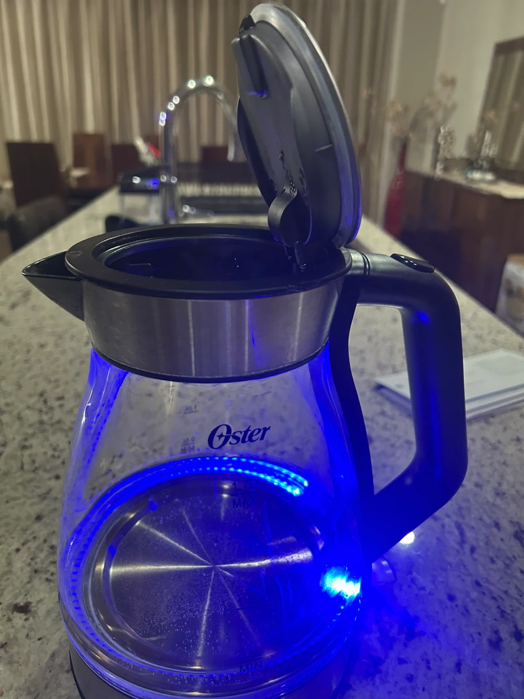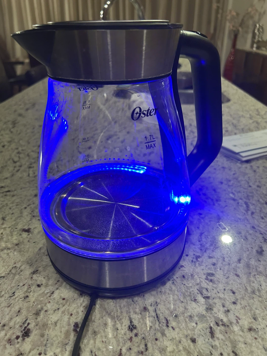 Selling a used Oster electric kettle. It's made of glass and has a 1.7L capacity. The kettle lights up with a cool blue light when it's heating up