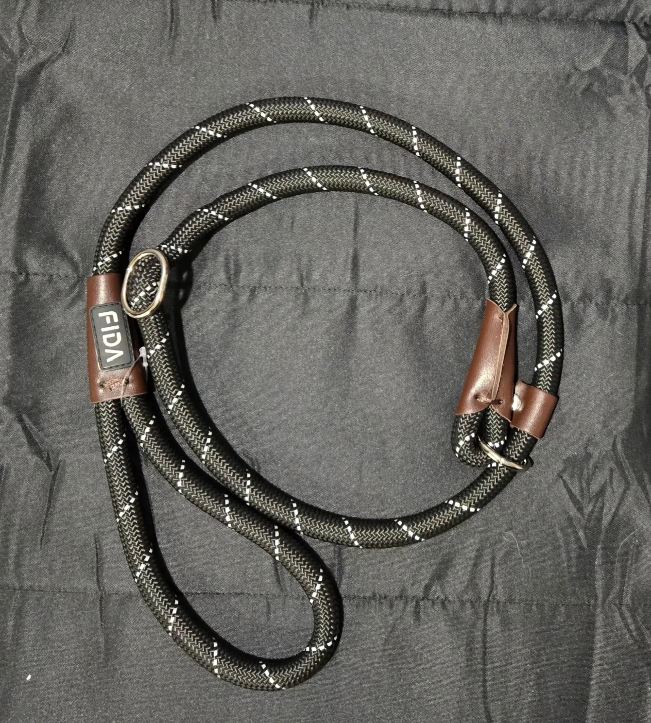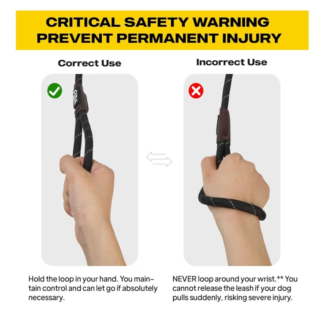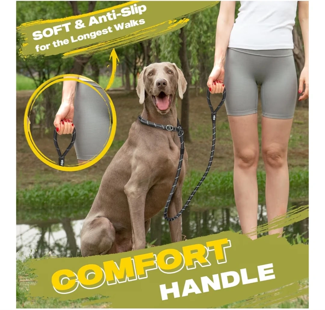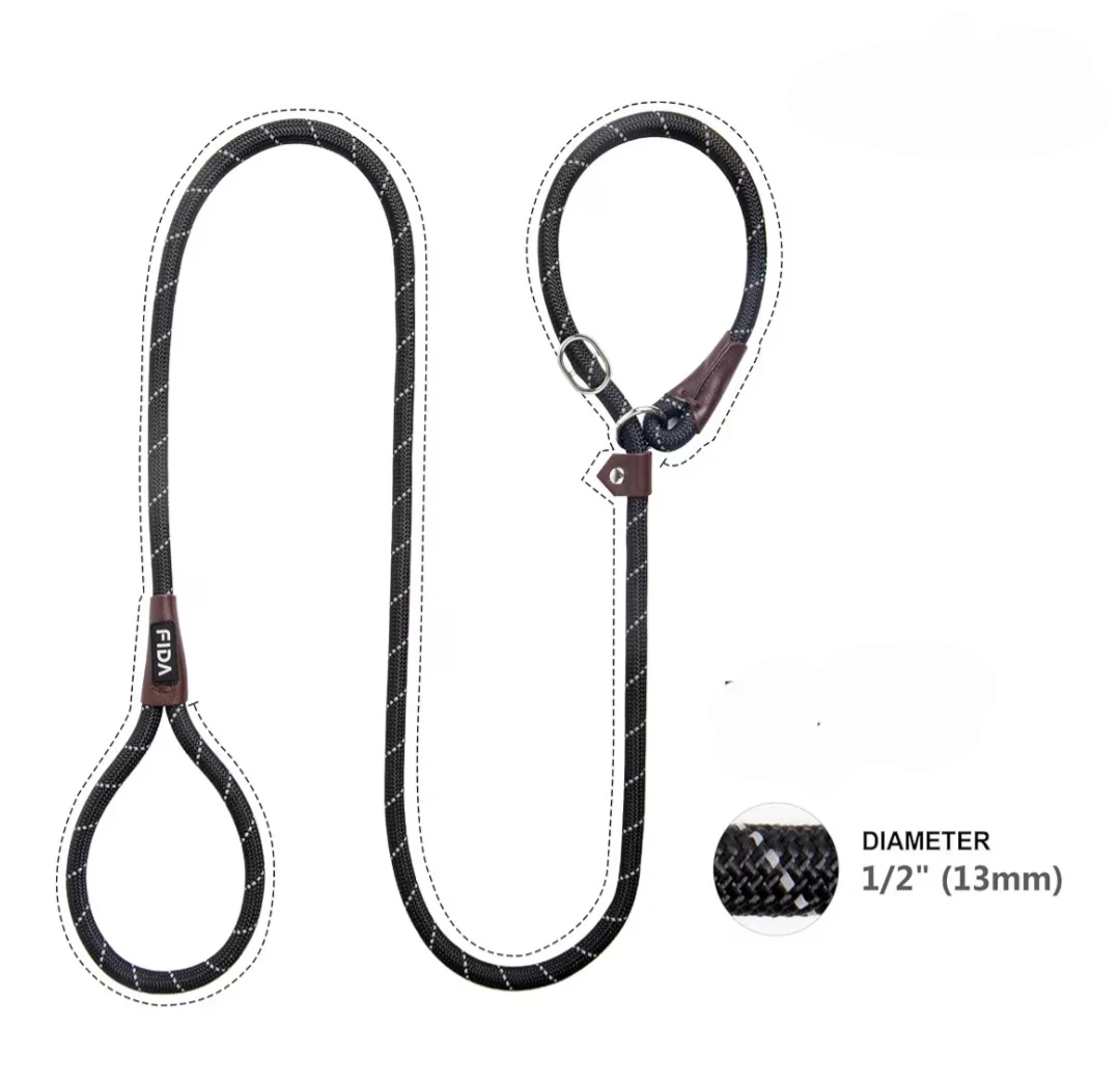 Dog rope slip lead leash is perfect for training or walks. It's black with reflective stitching for safe night walking. The rope diameter is 1/2" (13mm).