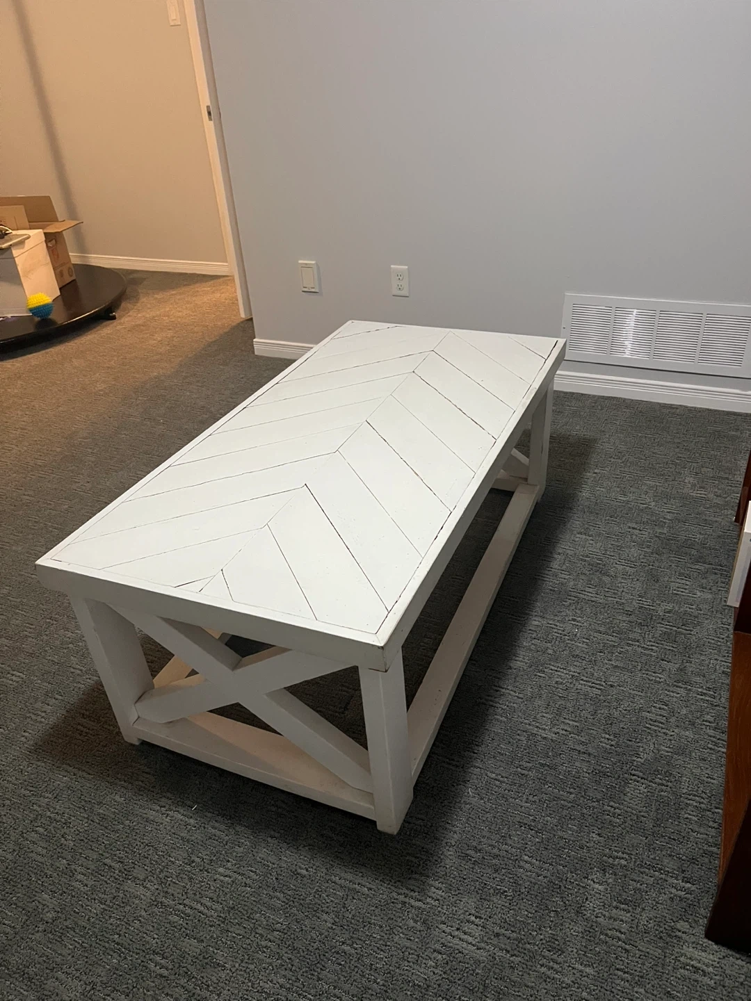 Selling a cute white wooden coffee table! It's in great condition and has a unique herringbone pattern on top. Perfect for adding a touch of rustic charm to your living room