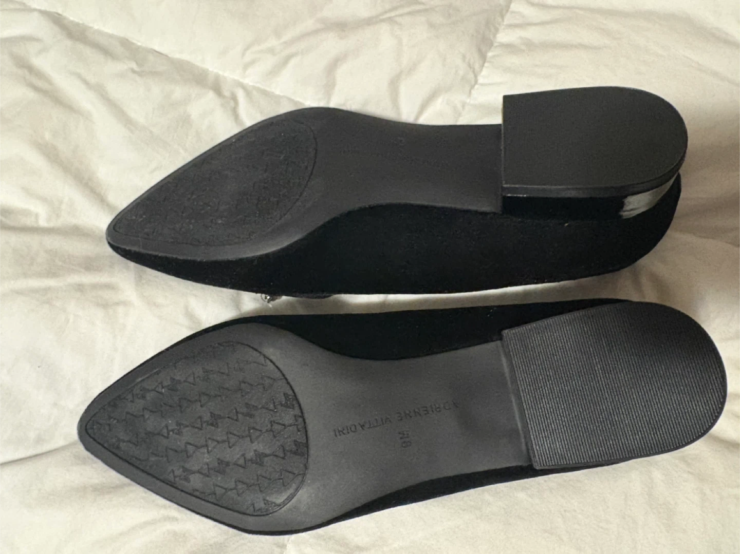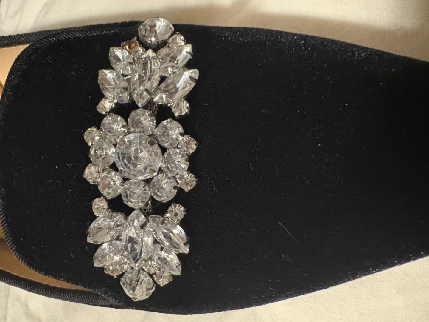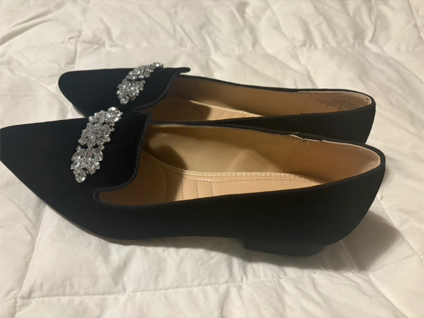 Selling a pair of Adrienne Vittadini black velvet loafers. They feature a decorative jeweled embellishment on the front. They are a size 9m brand new never used