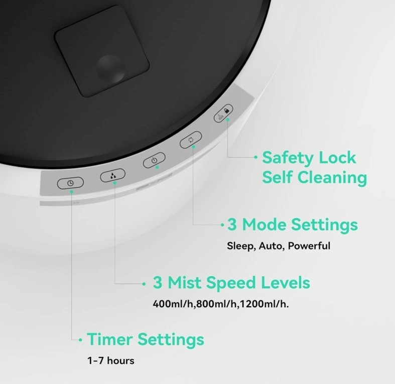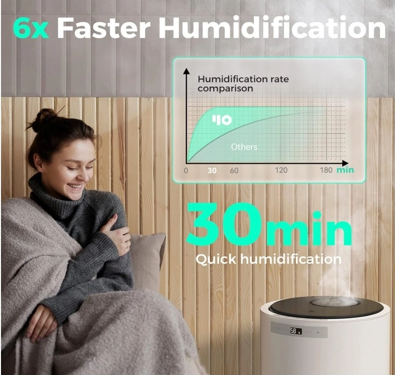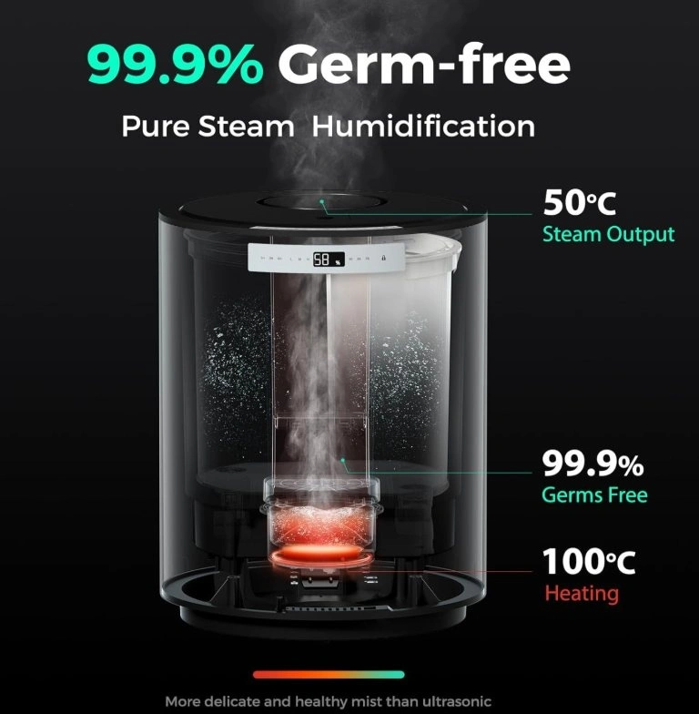 99.9% Germ-free - Steam humidifier offers more healthy and clean mist by heating evaporation technology - after high-temperature sterilization at 100 ℃, it is cooled to 50 ℃ through high and low pressure air ducts to output sterile distillation warm mist, making it suitable for use by people with rhinitis and respiratory tract sensitivity.