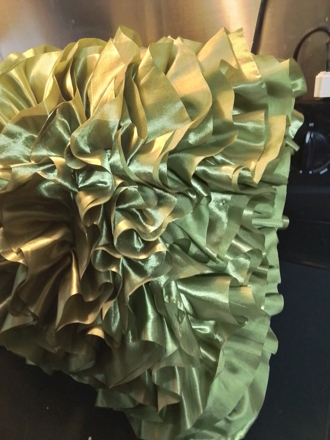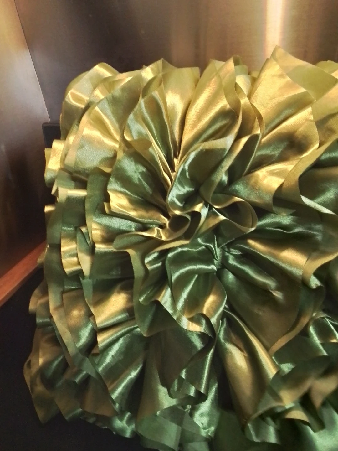 A beautiful decorative pillow with a unique ruffled design! The green colour adds a touch of elegance to any room. It's in great condition and ready to enhance your home decor