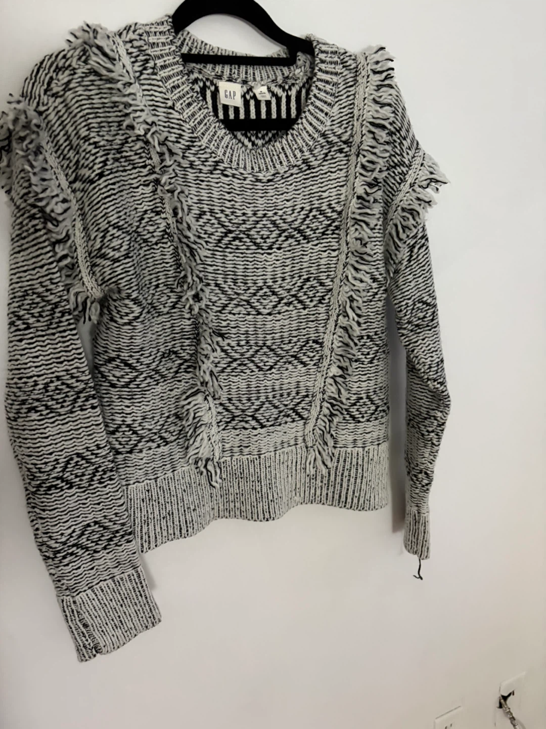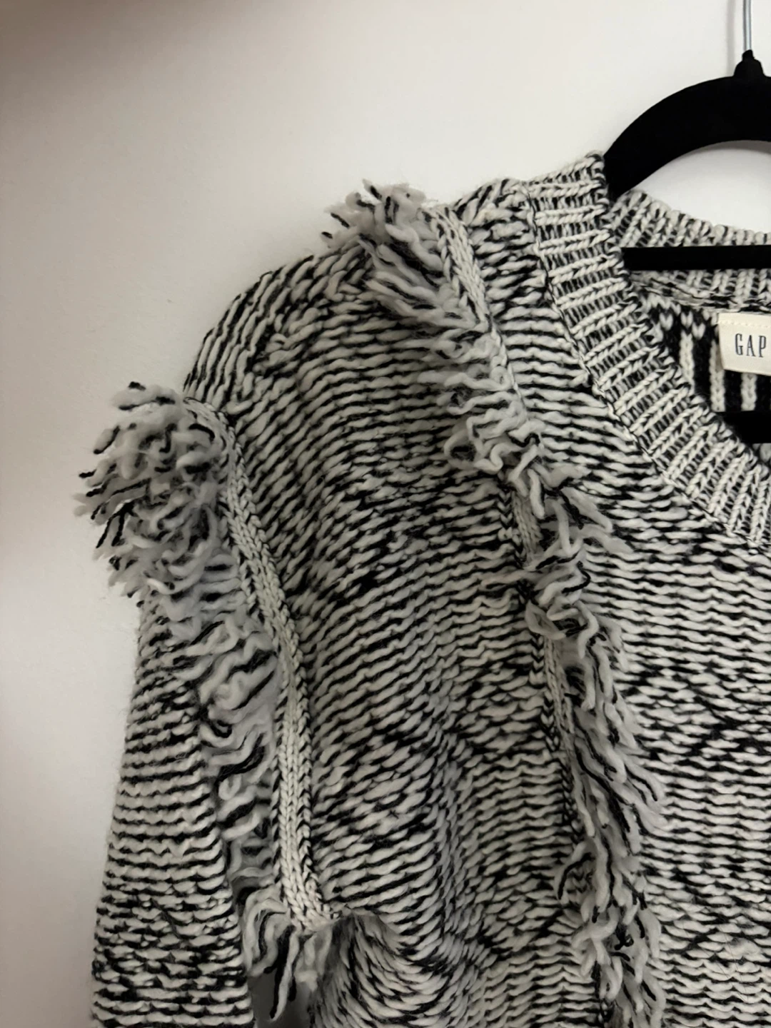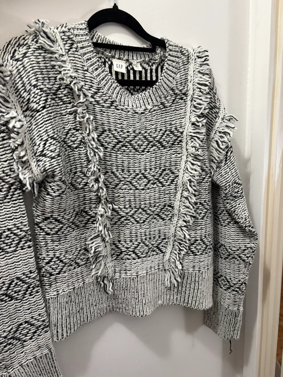 Selling a GAP sweater with a unique black and white pattern and fringe detailing! It's in great condition and ready to add some flair to your wardrobe