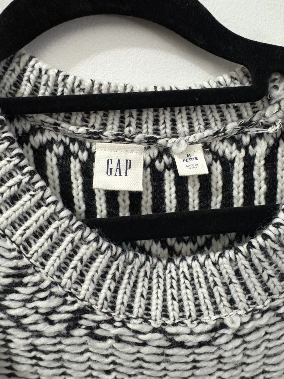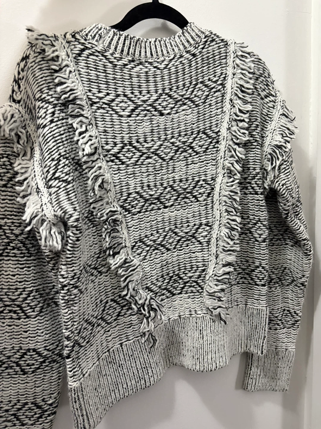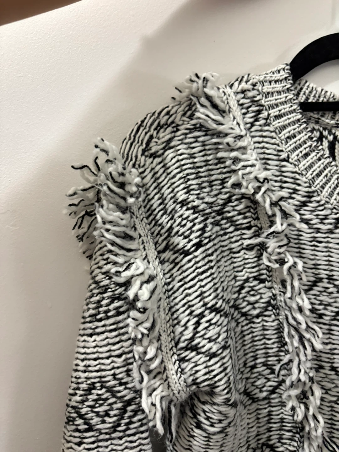 Selling a GAP sweater with a unique black and white pattern and fringe detailing! It's in great condition and ready to add some flair to your wardrobe