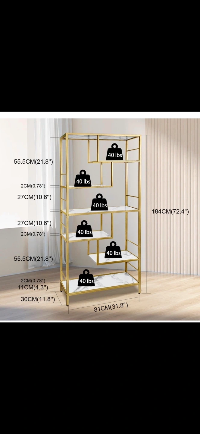 Looking to add some style and storage to your space? This AT-VALY 6-Shelf Bookshelf is a modern freestanding bookshelf that's perfect for living rooms, bedrooms, and home offices. It features 6 shelves, with an open display and storage shelves made of artificial marble and gold-tone metal. It stands 72.4 inches tall.