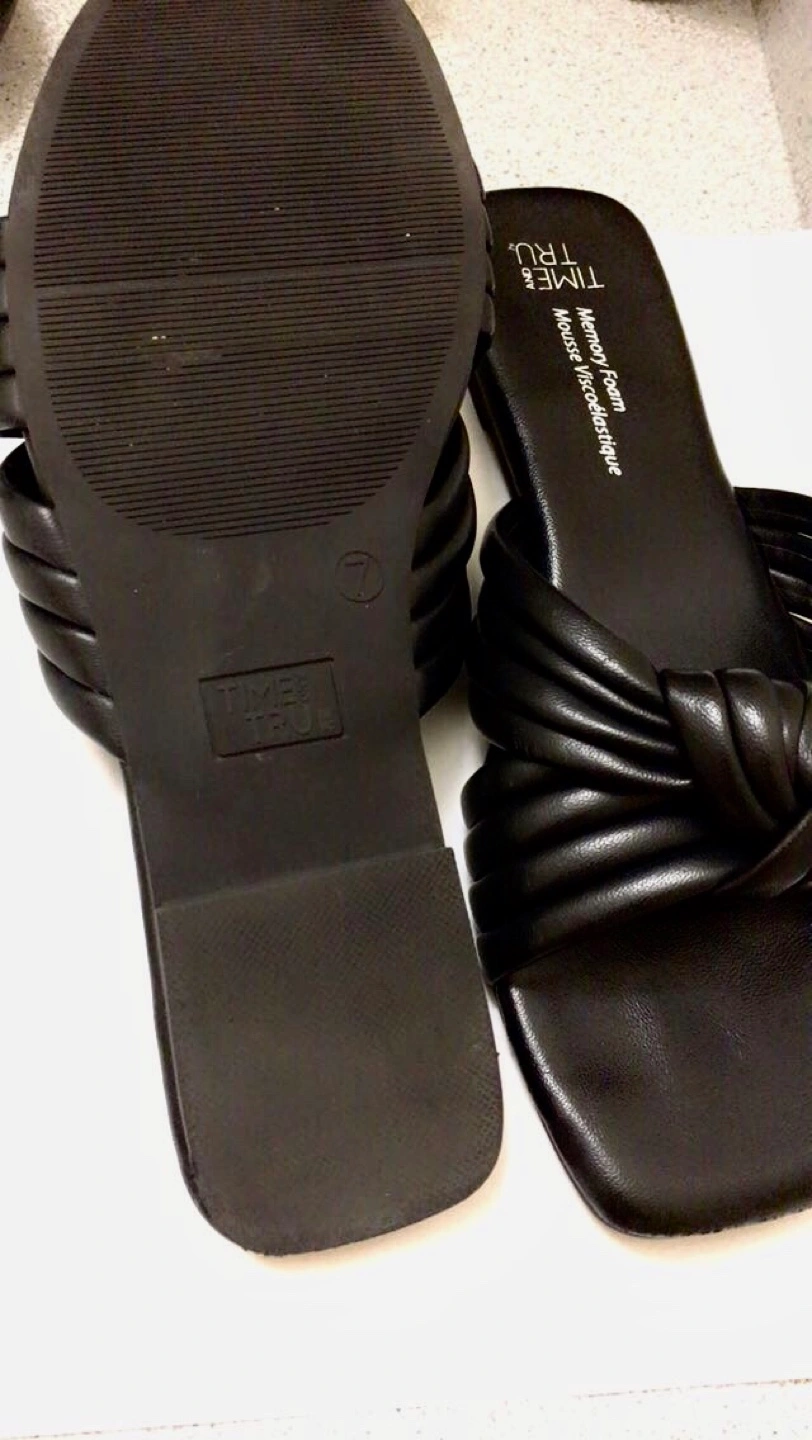 Selling a pair of Time and Tru sandals in size 7. They're black with a memory foam insole, super comfy for everyday wear!