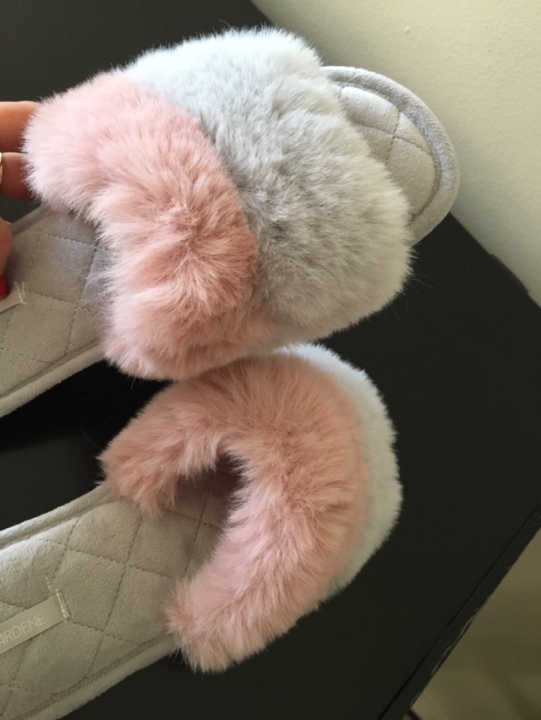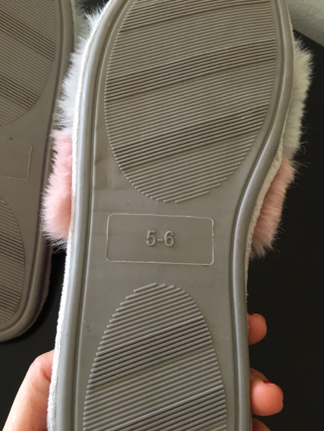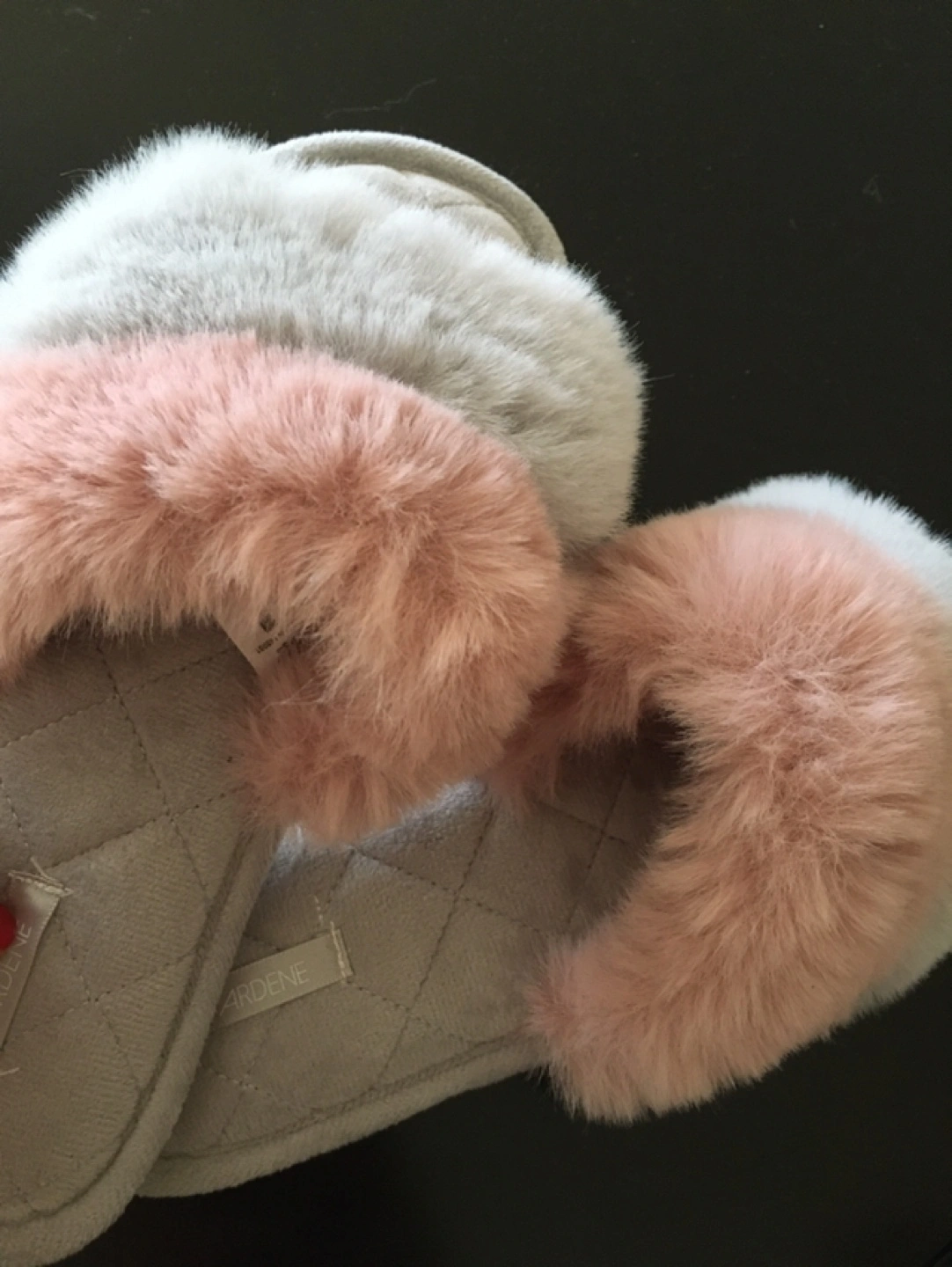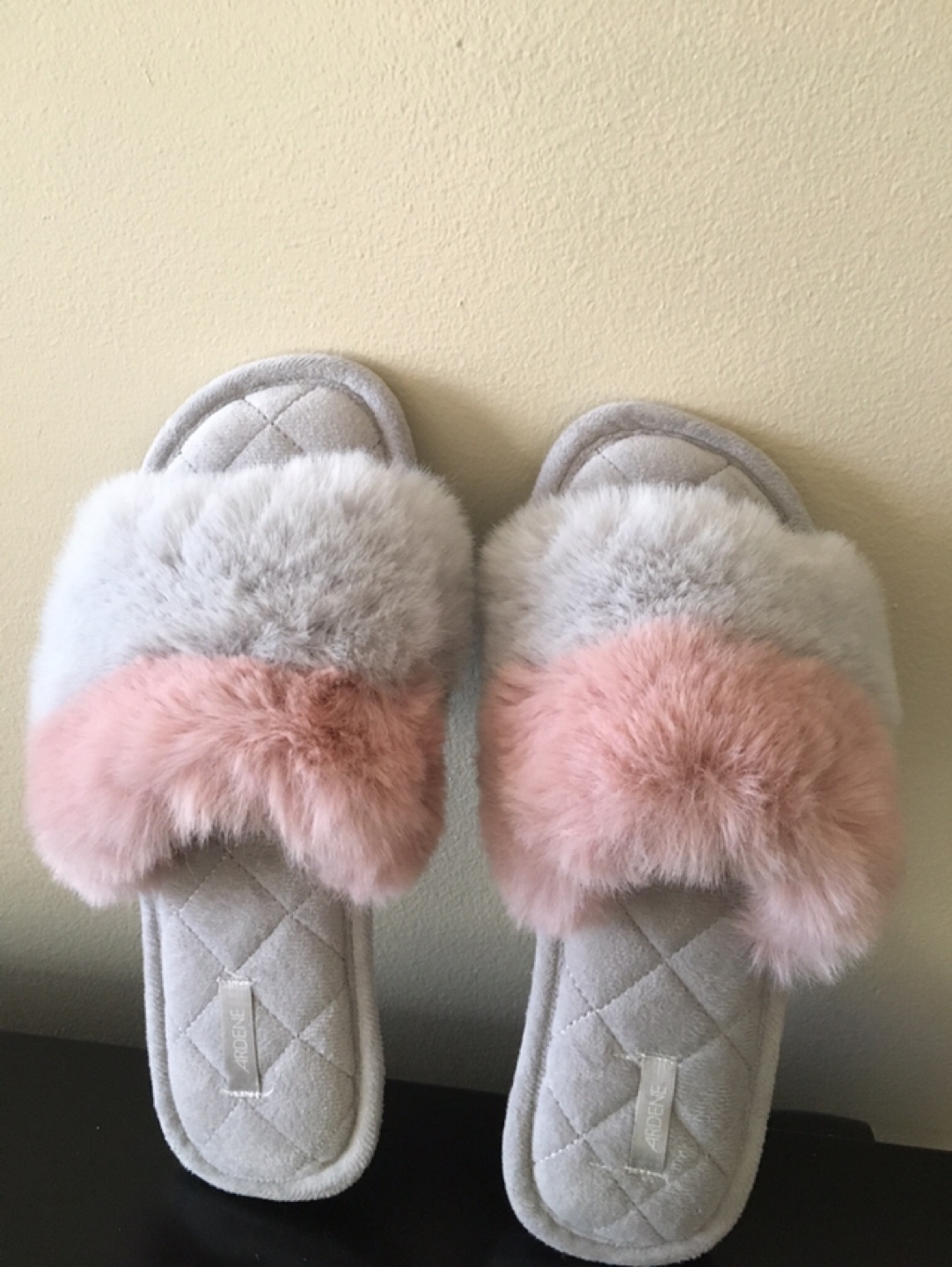 Fur slippers in size 5-6! They feature a soft, quilted footbed and fluffy pink and grey faux fur trim. Perfect for keeping your feet warm and comfy around the house