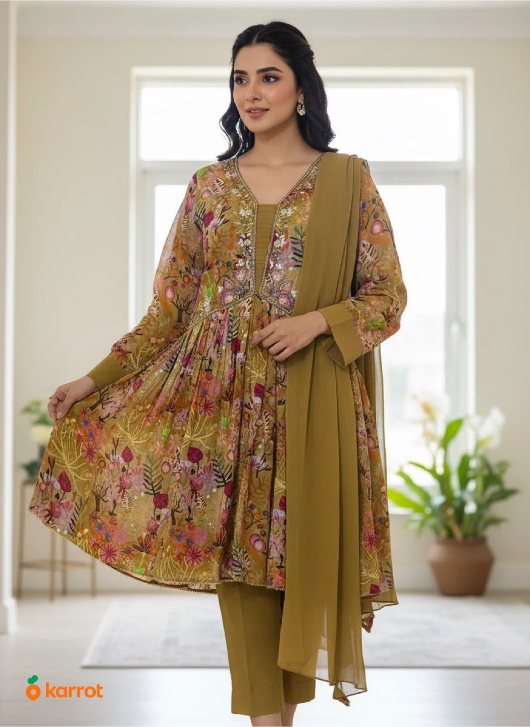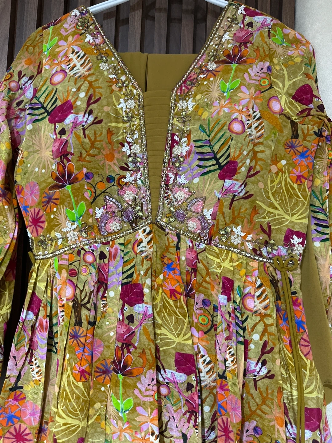 Beautiful floral print dress featuring delicate embellishments. The dress has a unique design and is perfect for special occasions or adding a touch of elegance to your wardrobe. It's in great condition and ready for a new home! Comes with pant and dupatta!