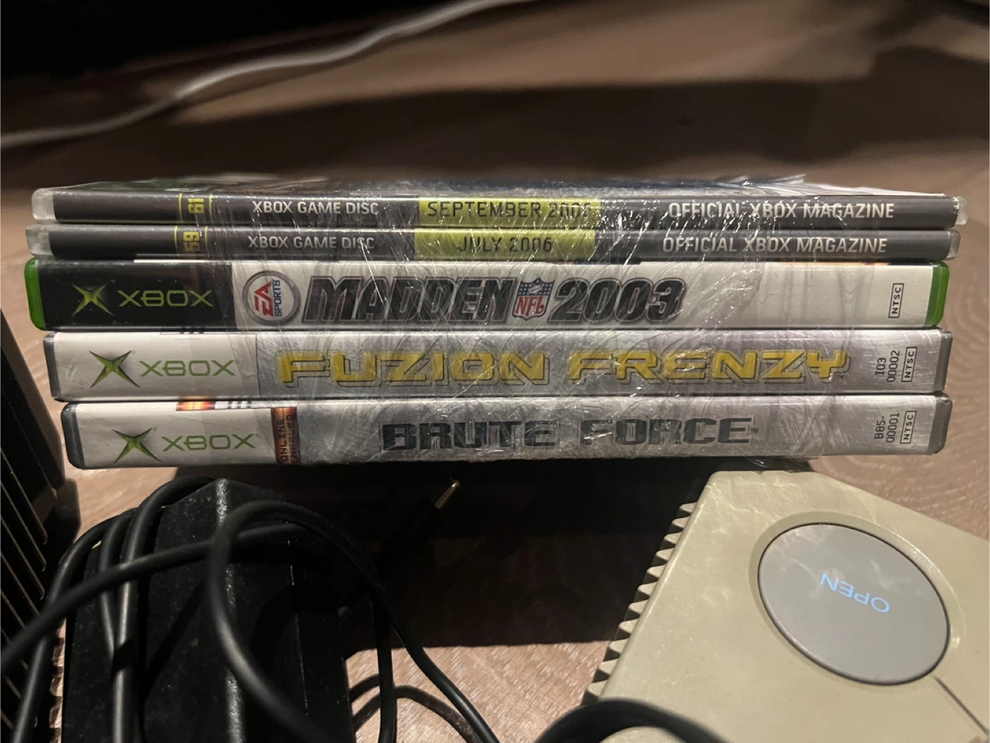 The Xbox comes with some cables and controller and some games like Madden NFL 2003, Fuzion Frenzy, and Brute Force.