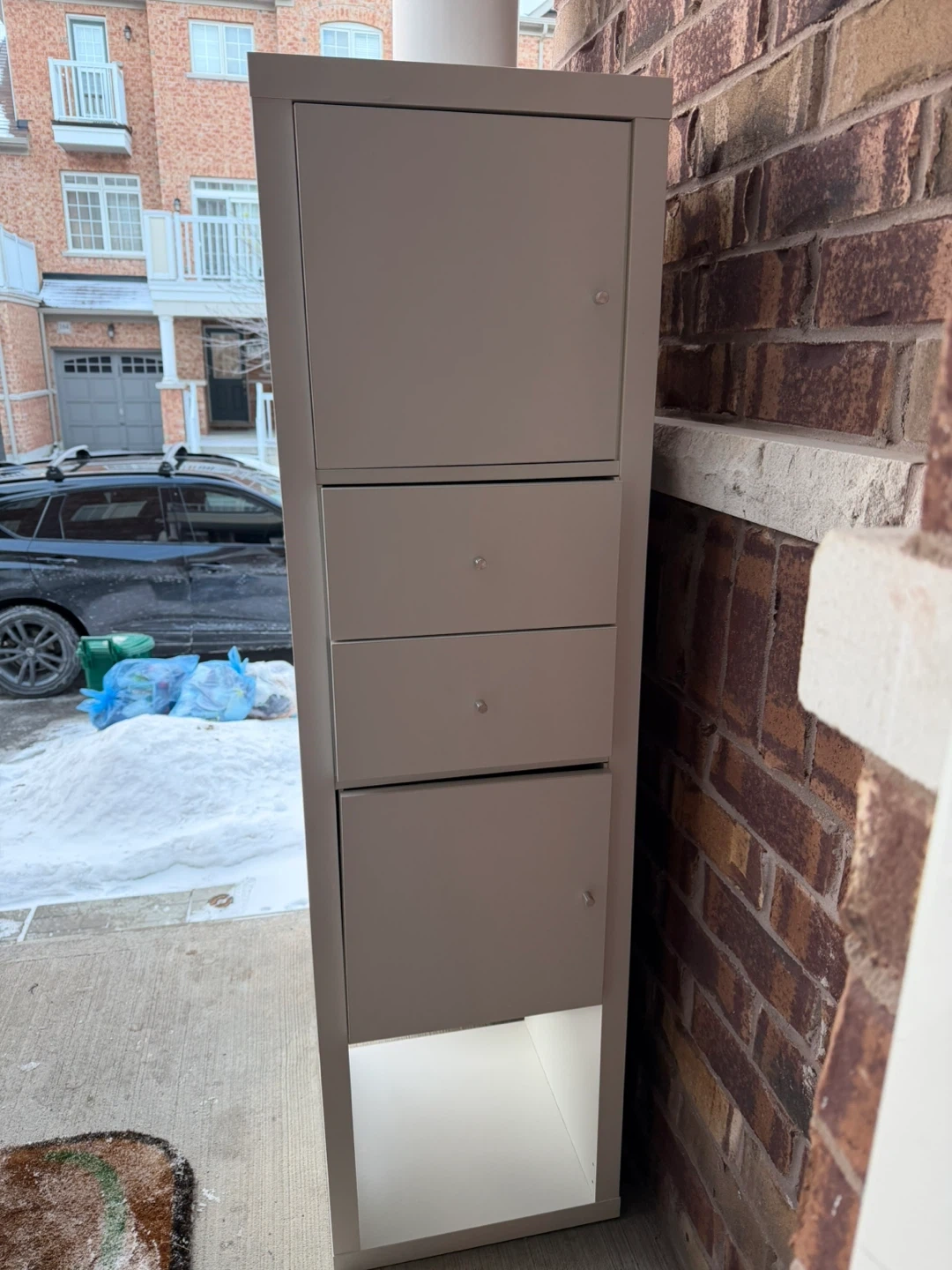 Selling a tall storage cabinet. It's a great piece for adding extra storage space in a hallway, entryway, or even a small apartment. It features a combination of drawers and a cabinet, offering versatile storage options. The neutral colour ensures it fits seamlessly into any decor style