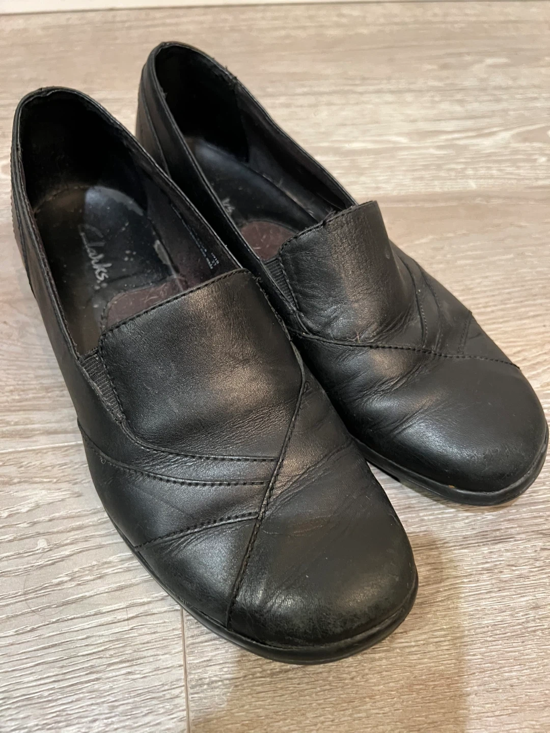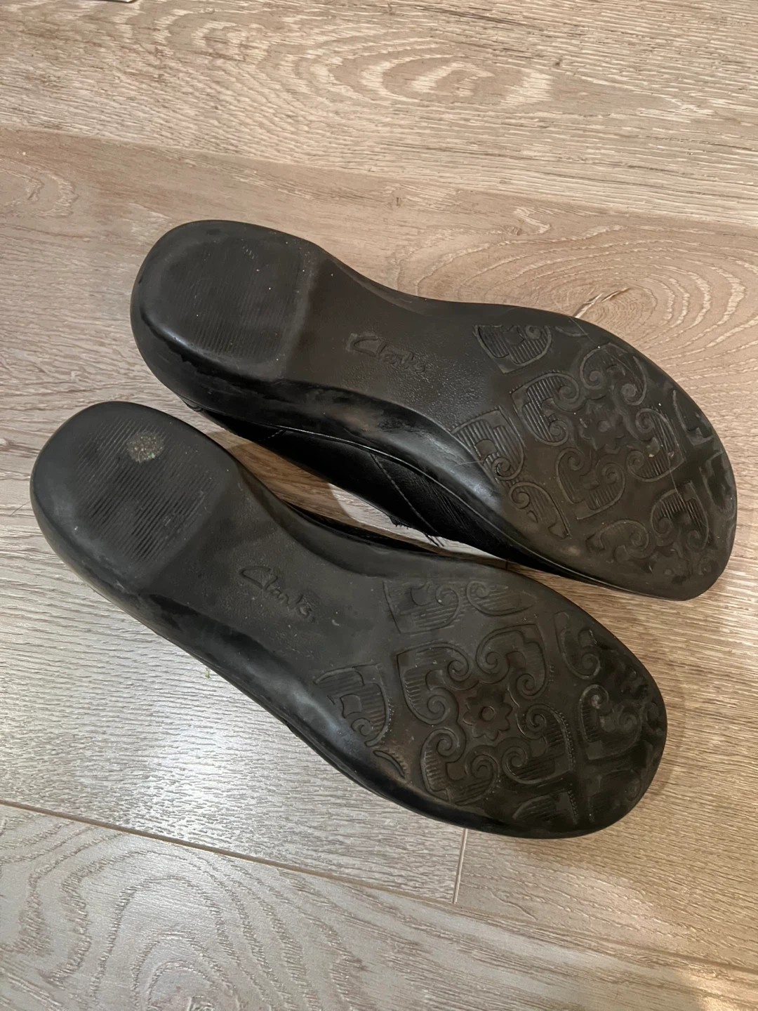 Selling a pair of Clarks black leather loafers in size 8. These shoes are in good condition and are perfect for everyday wear. They feature a comfortable design with a classic look. The material is durable and the sole provides good traction. A great addition to your shoe collection!