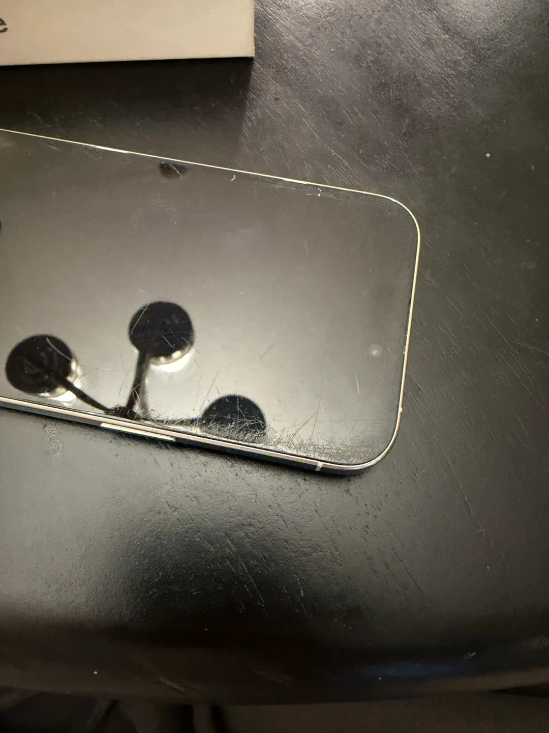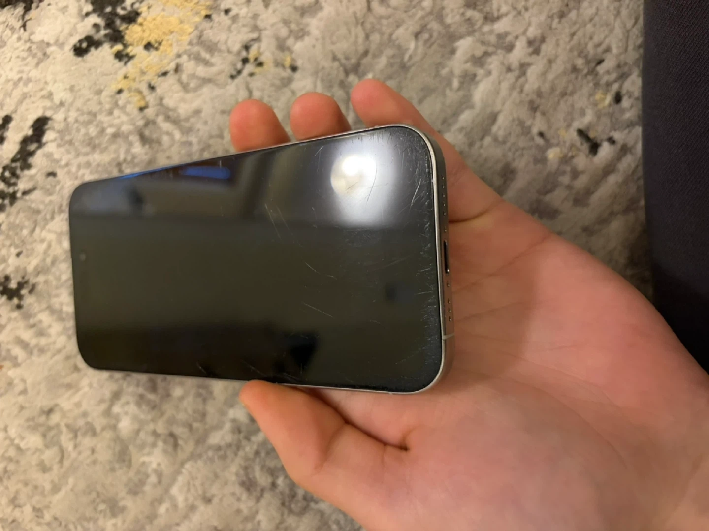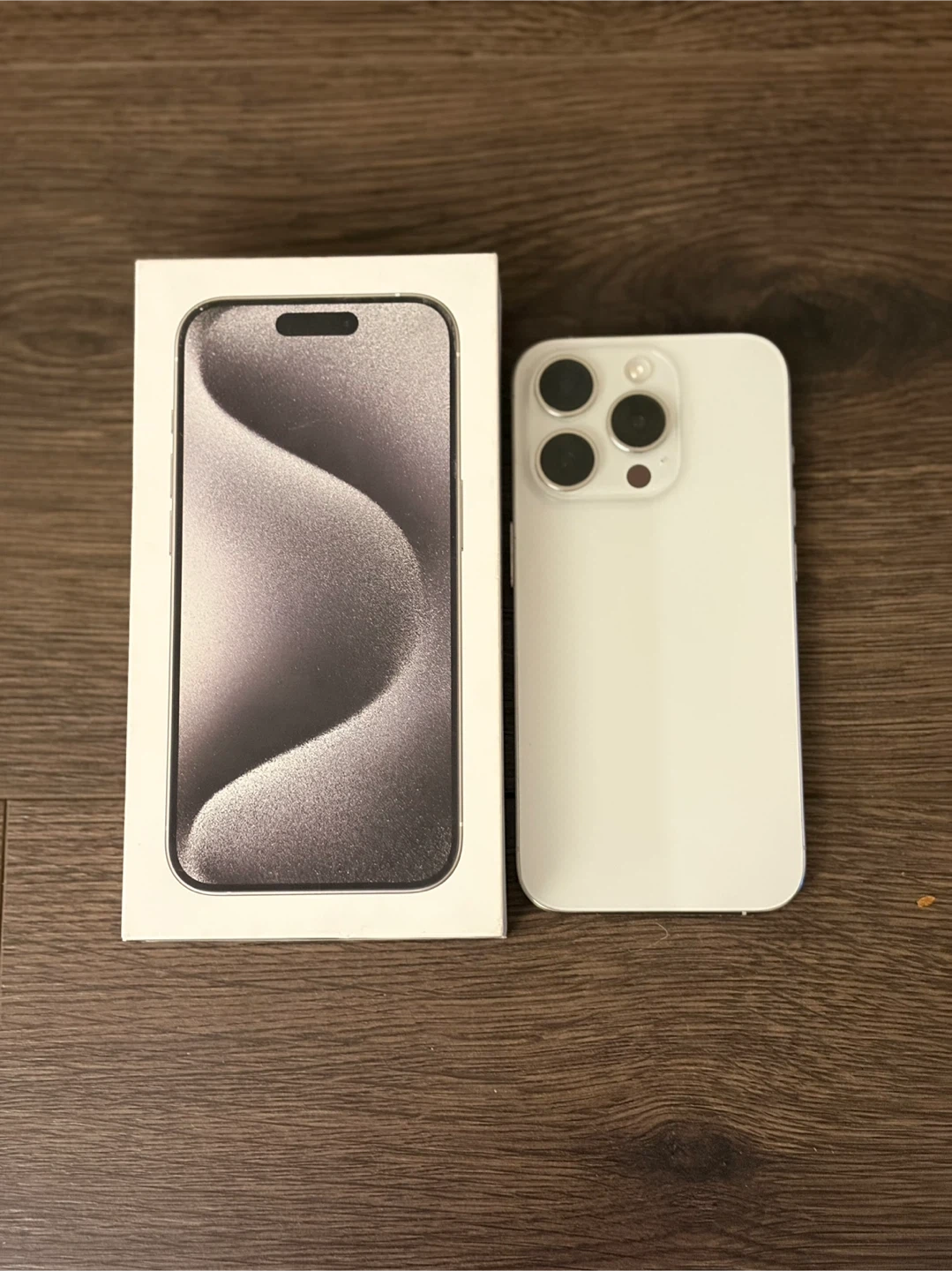 Selling an iPhone 15 Pro in White Titanium with 128GB of storage. It comes with the original box. There are some scratches on the screen, as shown in the photos.