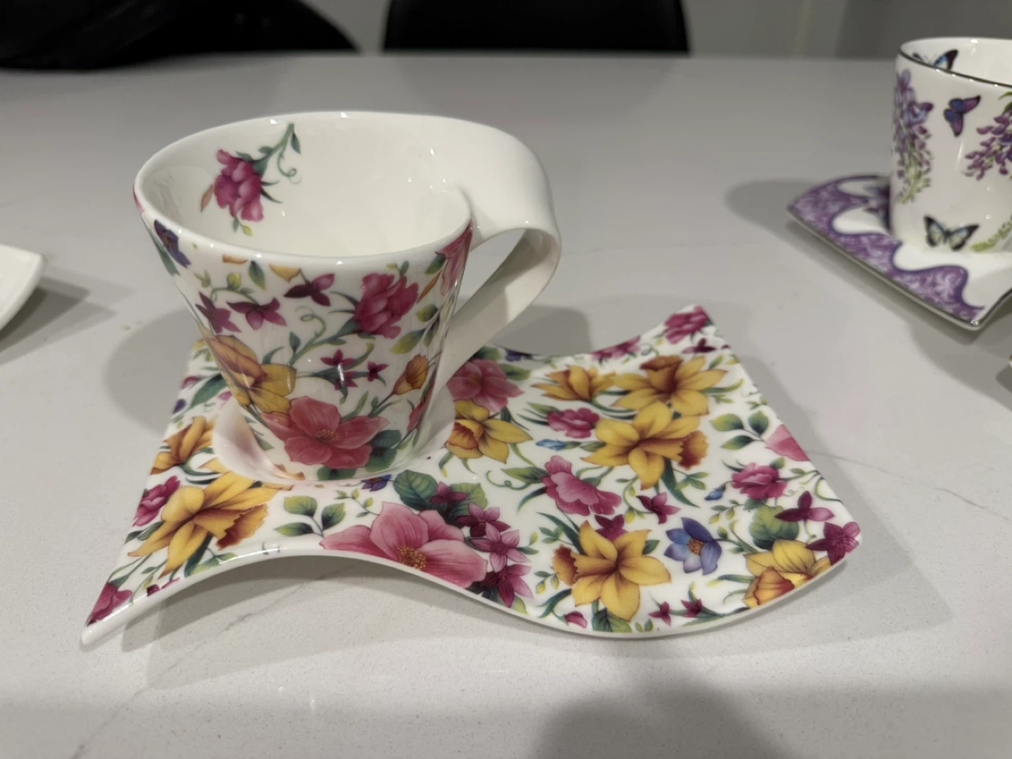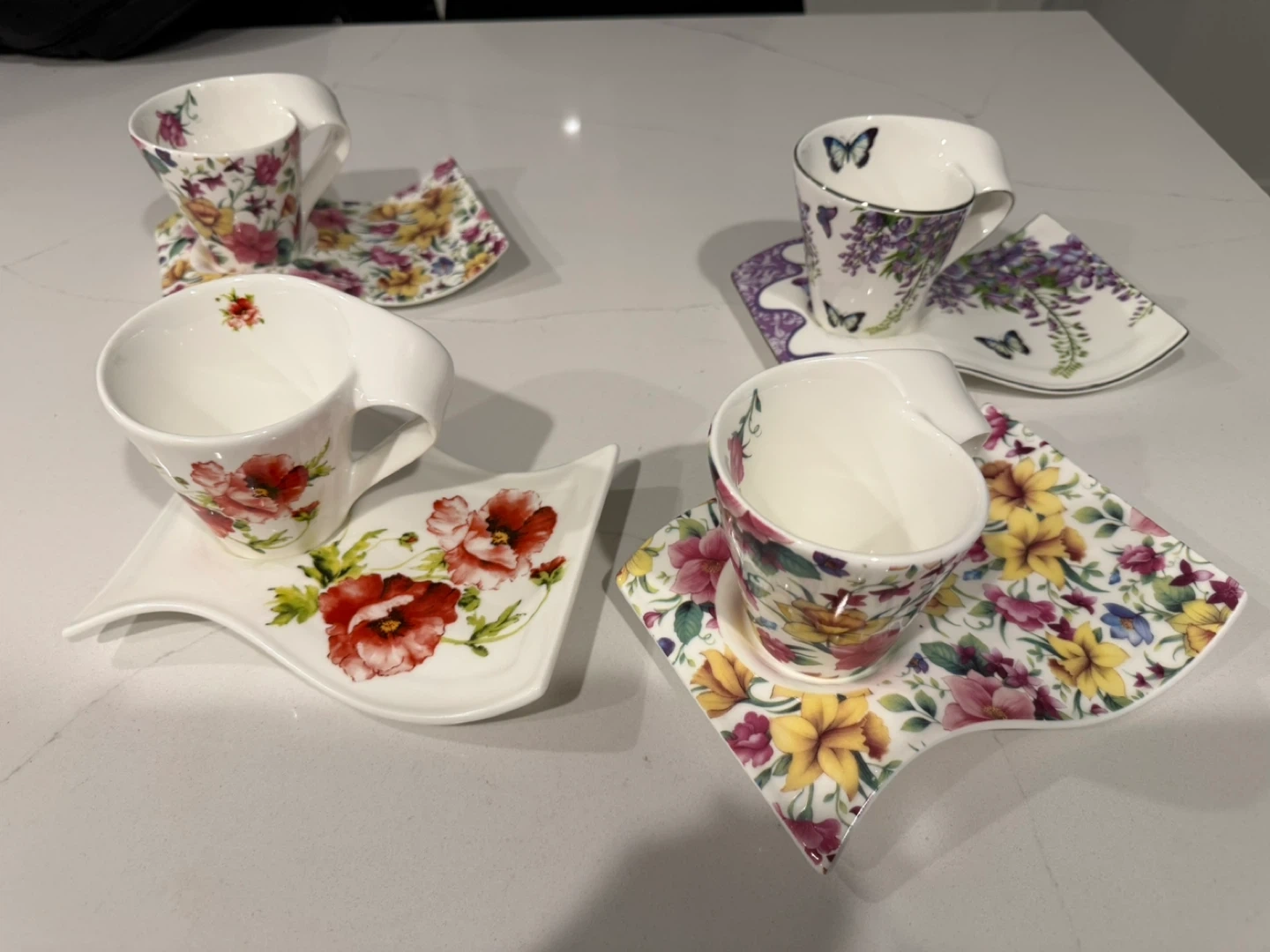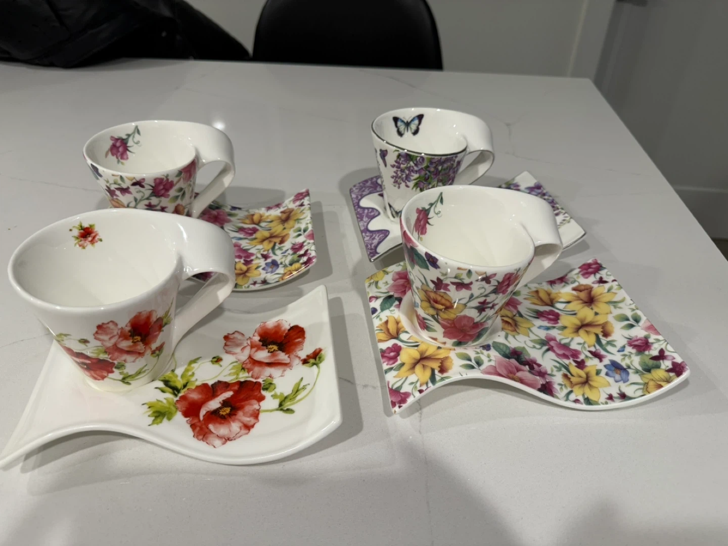Selling a set of 4 floral tea cups with matching saucers. They feature different floral patterns and a unique, modern design. Perfect for tea time or adding a touch of elegance to your kitchen!