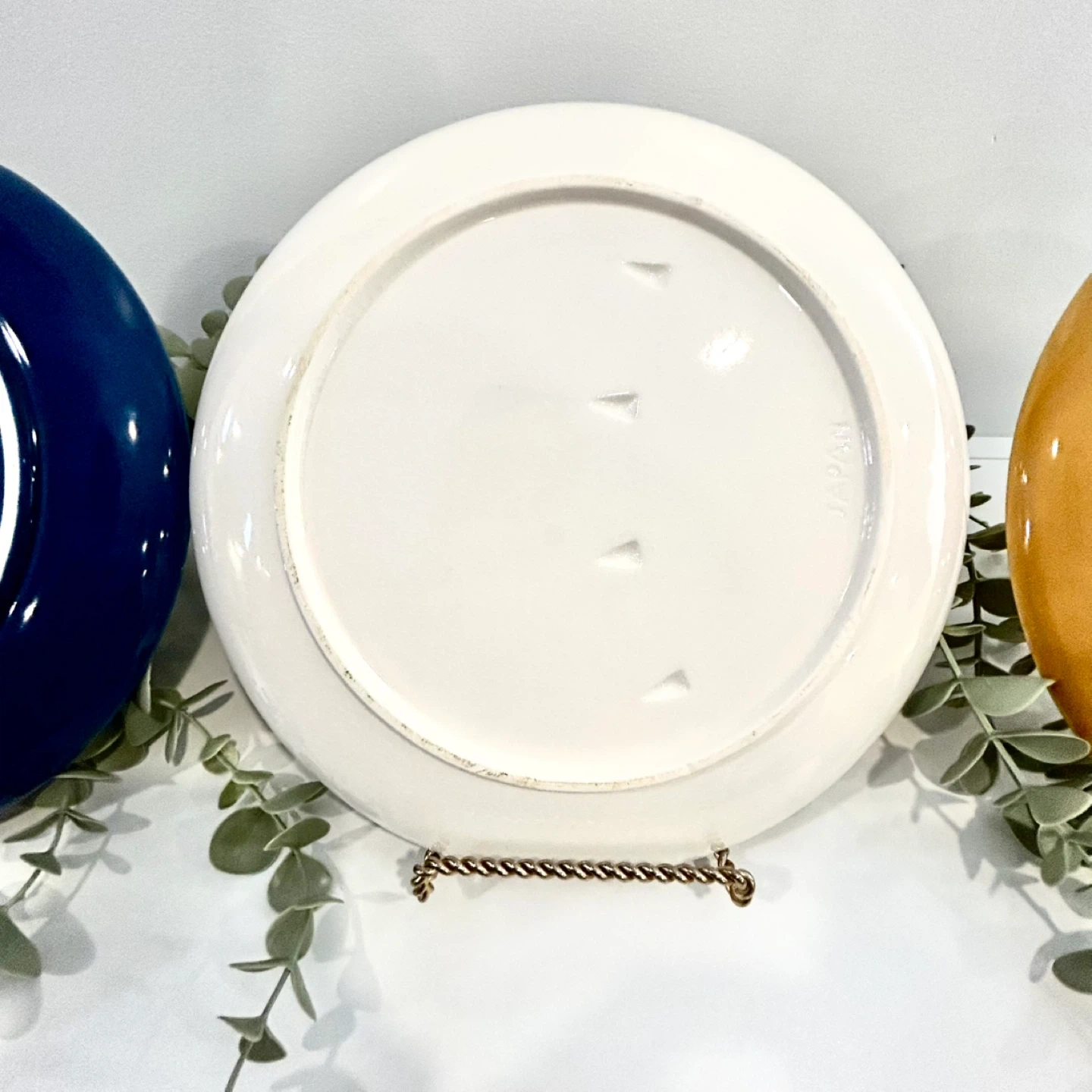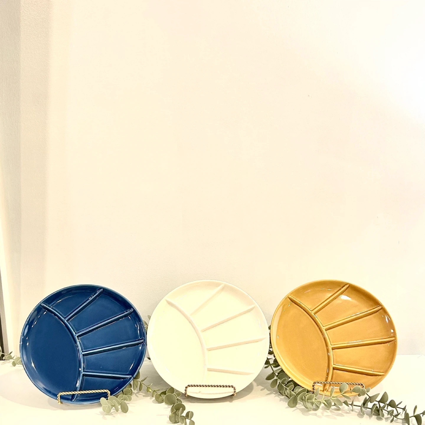The set includes three matching plates in coordinated glazes: