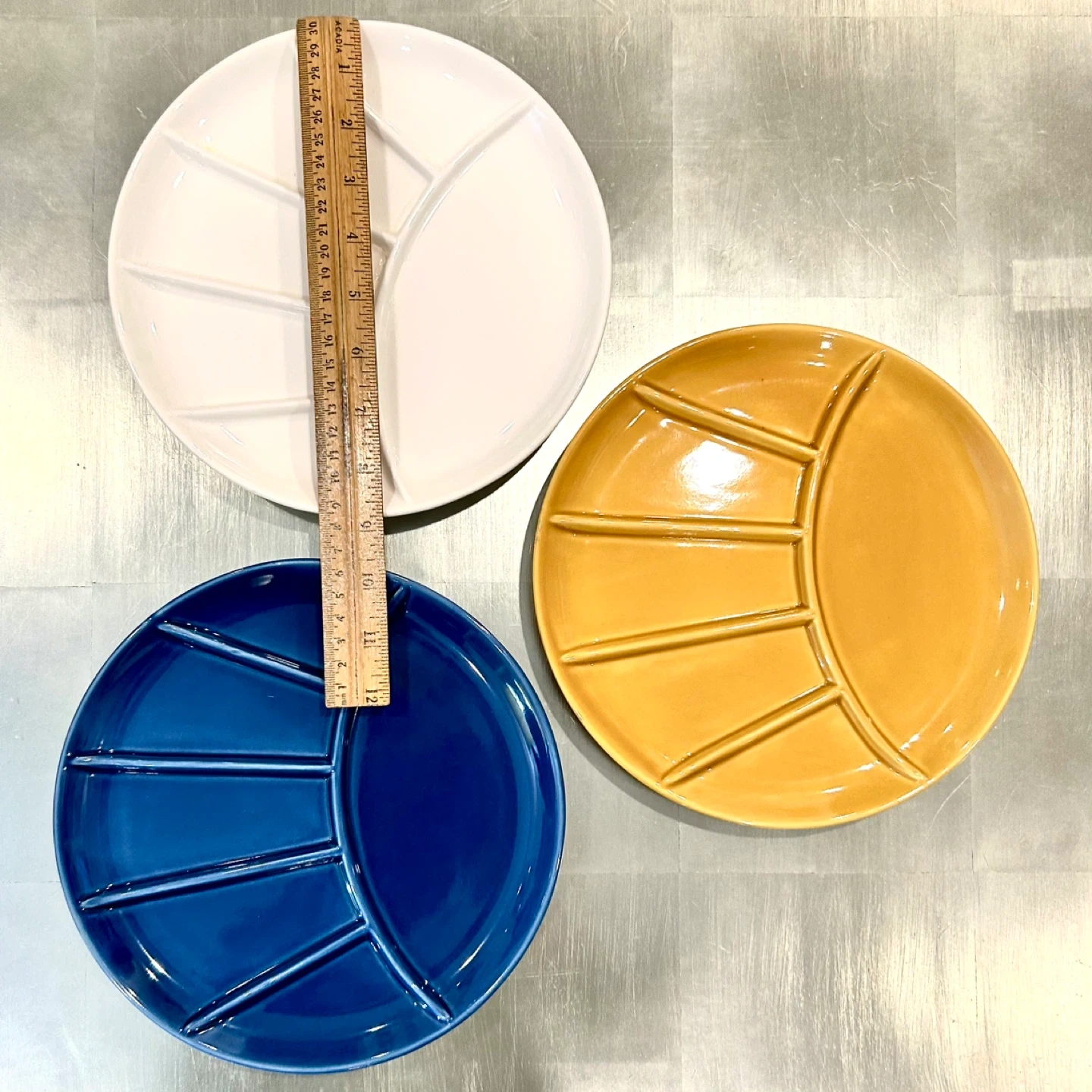 These plates were designed as hors d’oeuvre or relish trays, but today are prized primarily as display ceramics due to their strong modernist geometry and glaze quality.