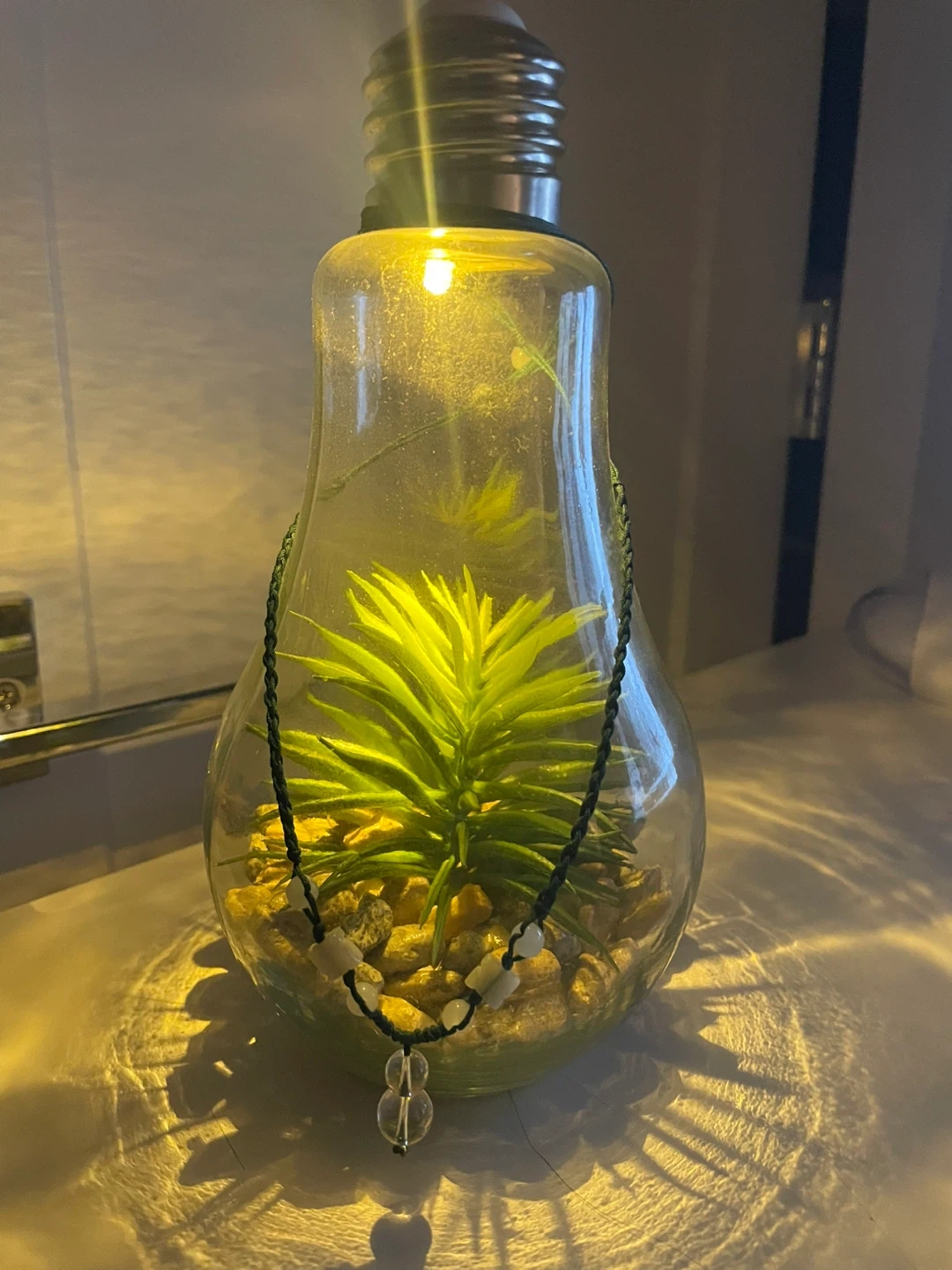 This is a beautiful upside down lightbulb with fake plants and rocks inside. It lights up from above
