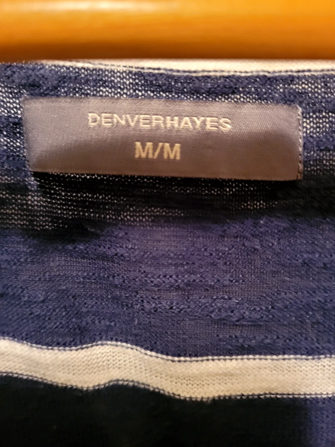 This is a Denver Hayes striped top in size M. It features a V-neck and a comfortable fit, perfect for casual wear. The material is lightweight and breathable, making it ideal for warmer weather