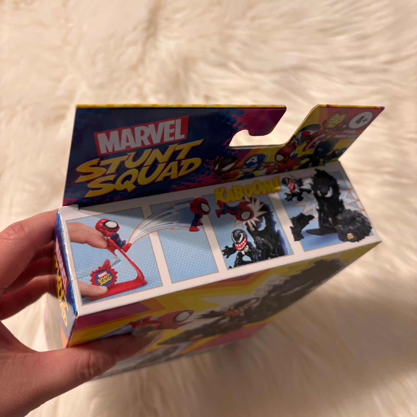 Selling a Marvel Stunt Squad set featuring Spider-Man versus Venom! The box includes the figures and accessories for some action-packed fun. It's suitable for ages 4 and up, and the packaging is plastic-free, except for tape and glue