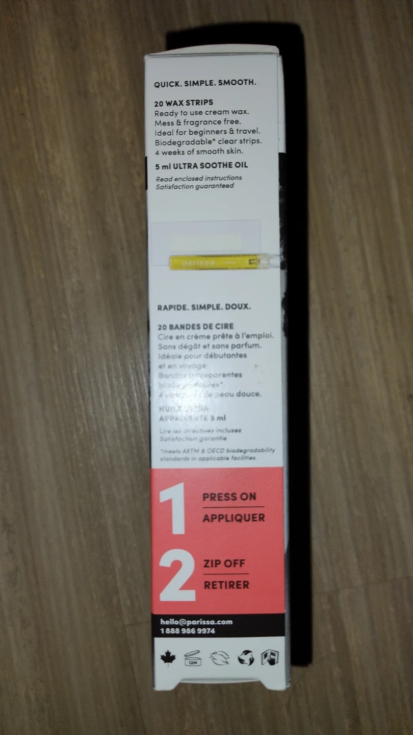 Includes 18 wax strips (2 were used) + 2ml Ultra Soothe Oil. These are all-natural hair removal wax strips designed for all hair types. Quick and easy to use.