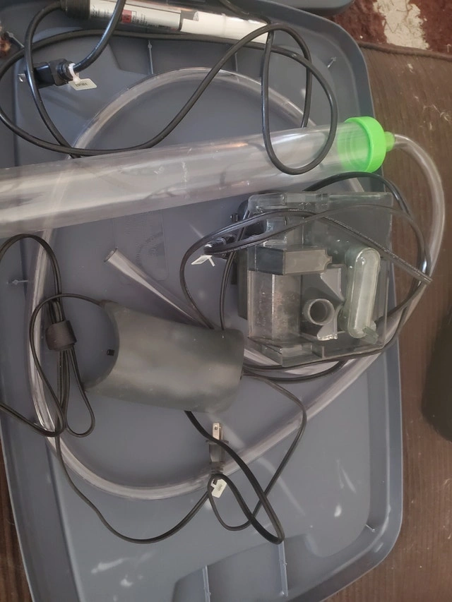 Tank size Hight 1 ft 4.5 inch Width 2ft Depth 1ft. Comes with: Filter, air pump, heater, cleaning accessories, light timer, numerous decorations from plants to artificial rocks, and black floor rocks. Cash accepted.