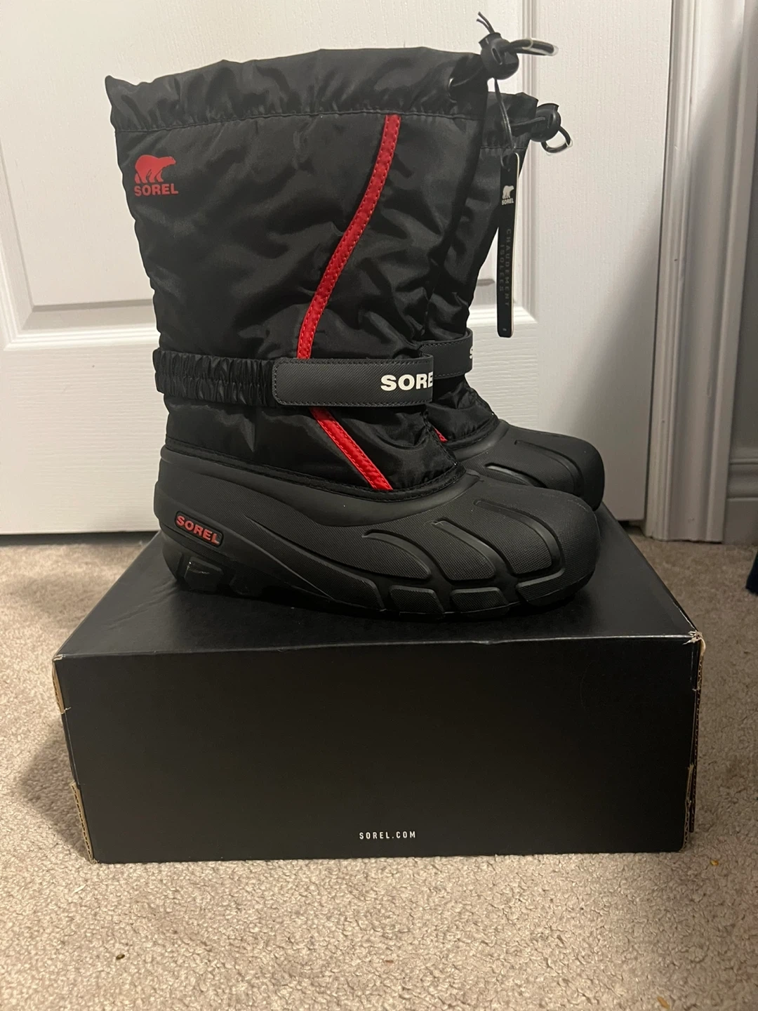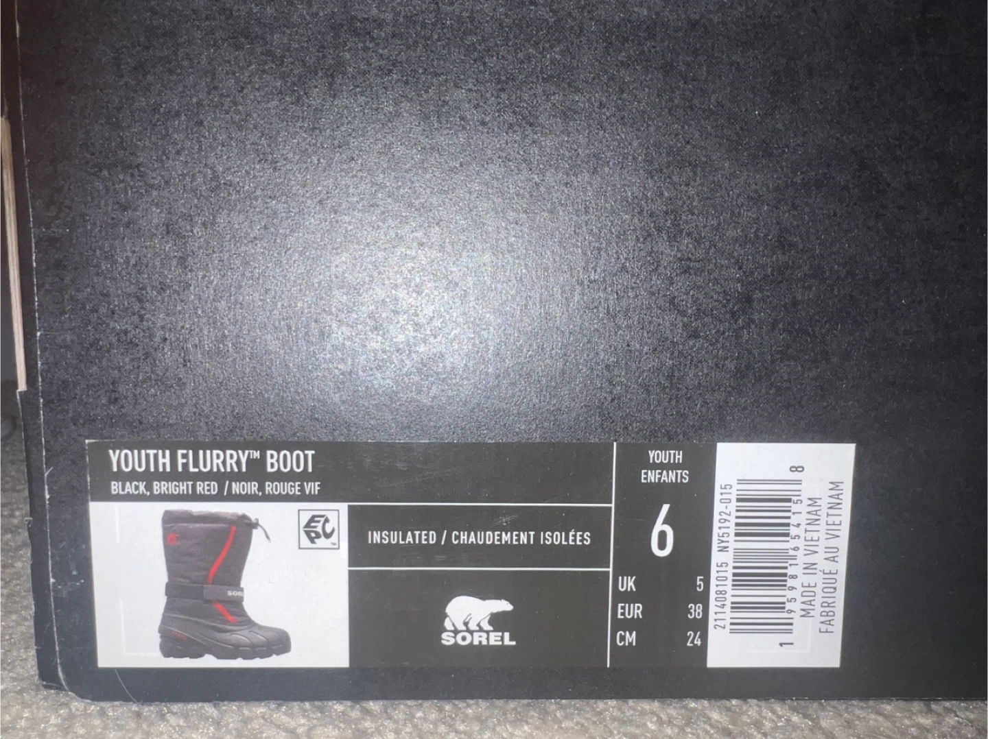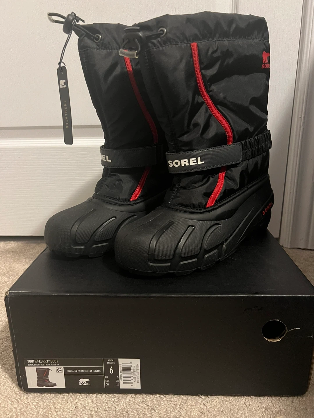 Sorel Youth Flurry Boots in black and bright red, SIZE 6. These boots are insulated and come with the original box and tag.