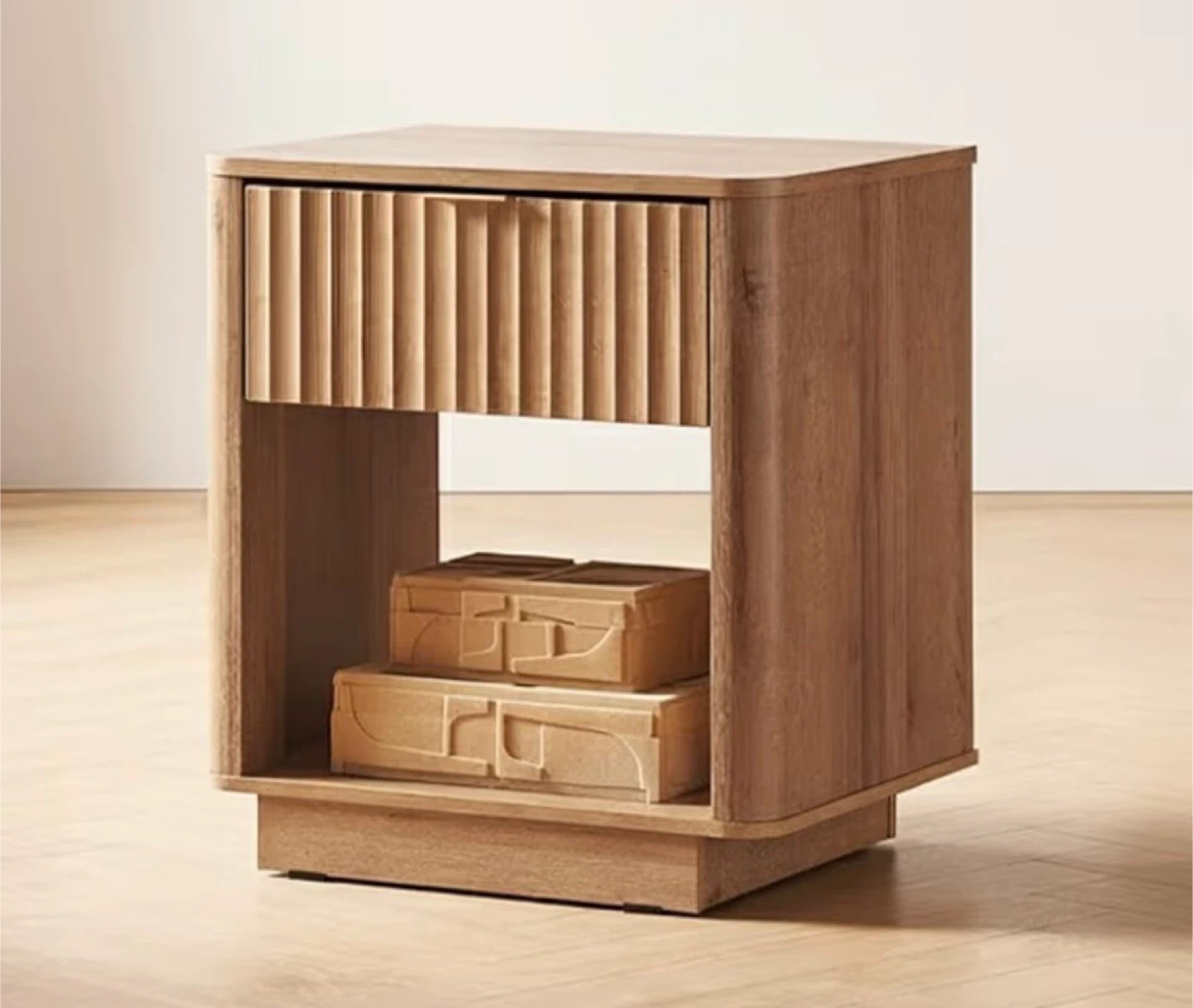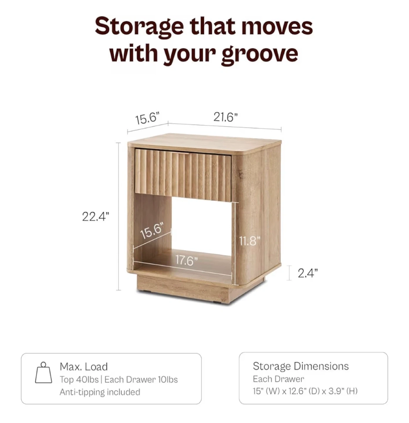 This wood nightstand features a natural wood grain finish and a smooth-gliding drawer. It has both open and hidden storage for essentials.