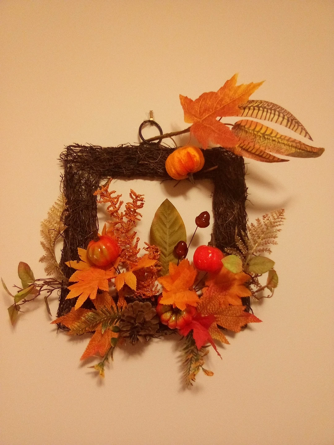 Here's a lovely fall-themed square wreath, perfect for adding a touch of autumn charm to your home! It features a mix of orange and red leaves, mini pumpkins, and berries, all arranged on a rustic twig frame