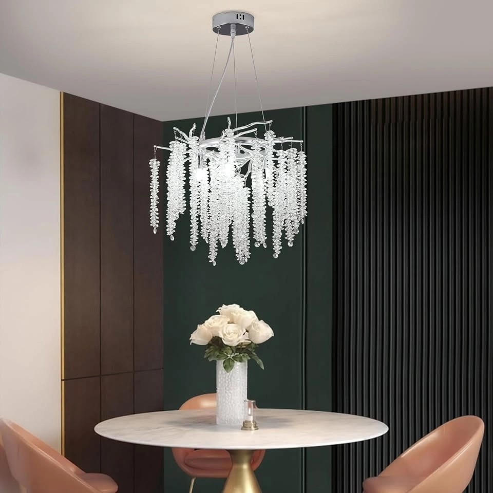 Perfect combination of silver finished aluminum tree branch and sparkling clear K9 crystal, modern luxury art deco design lighting fixture. The beautiful reflection of light shone on the clear crystal, create a superior and classy atmosphere in your room.