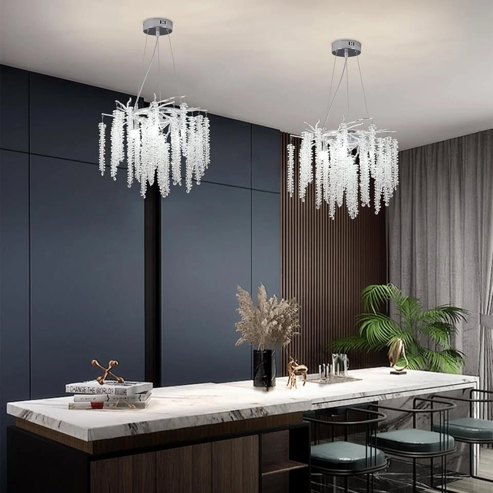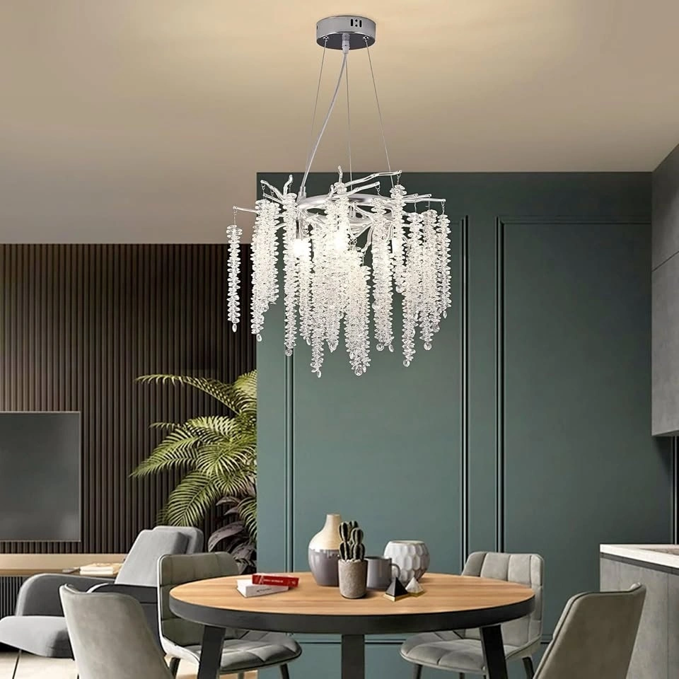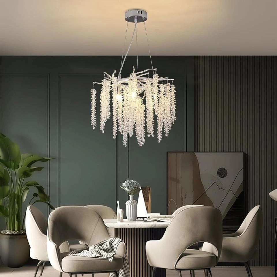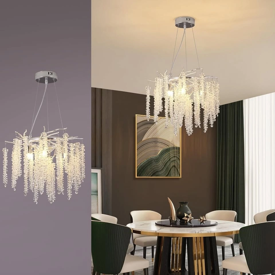 Perfect combination of silver finished aluminum tree branch and sparkling clear K9 crystal, modern luxury art deco design lighting fixture. The beautiful reflection of light shone on the clear crystal, create a superior and classy atmosphere in your room.
