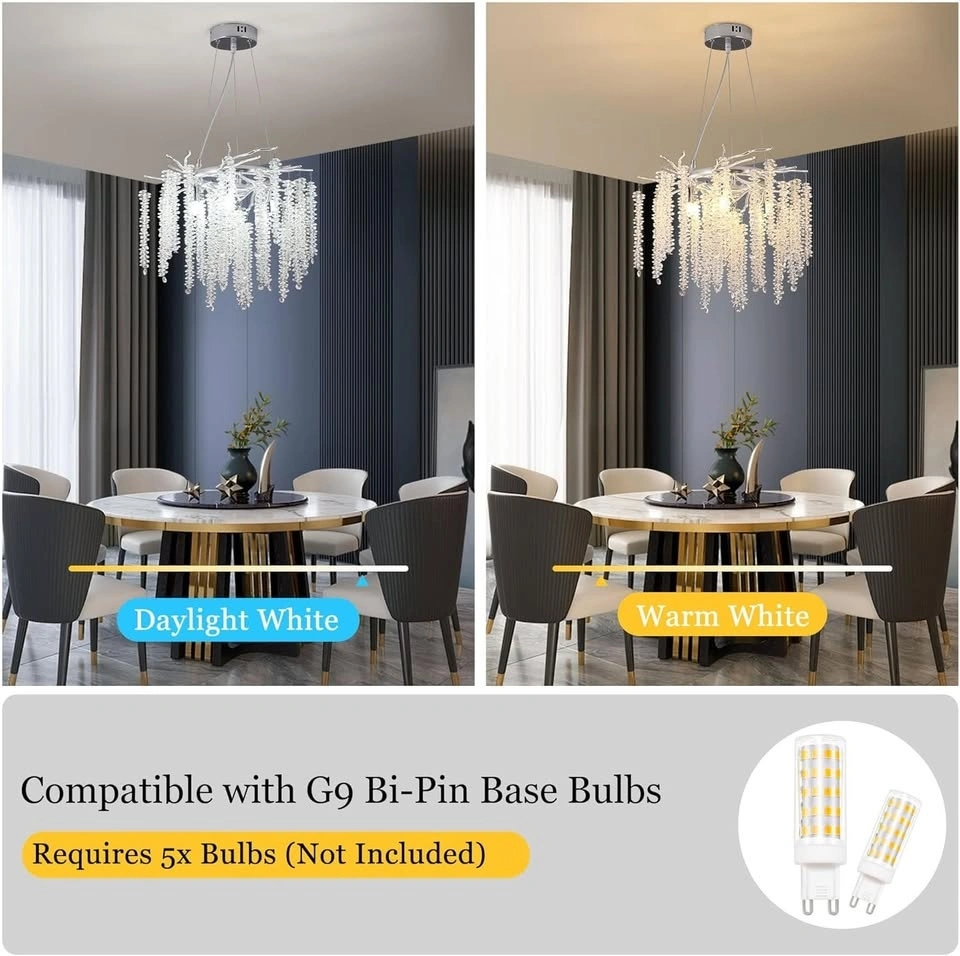 Designed with 5x G9 light sockets, Suitable for G9 bi-pin base bulb, easy to replace, the recommendation is to use 5W-10W LED bulbs. Fully dimmable when used with dimmable G9 bulbs and compatible dimmer switch. (bulb and switch not included).
