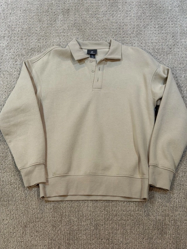 Get ready to elevate your casual wardrobe with this H&M polo sweatshirt in a size small. This used sweatshirt features a relaxed fit and a stylish polo neck design, perfect for a laid-back yet put-together look. Grab this cozy and fashionable piece today!