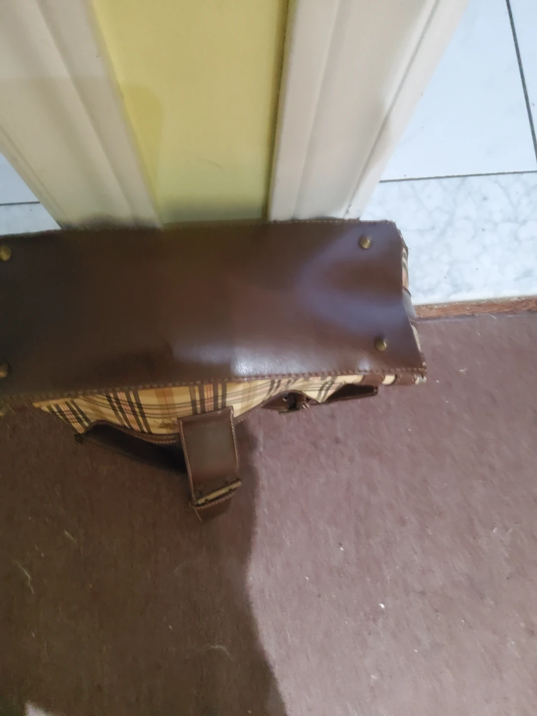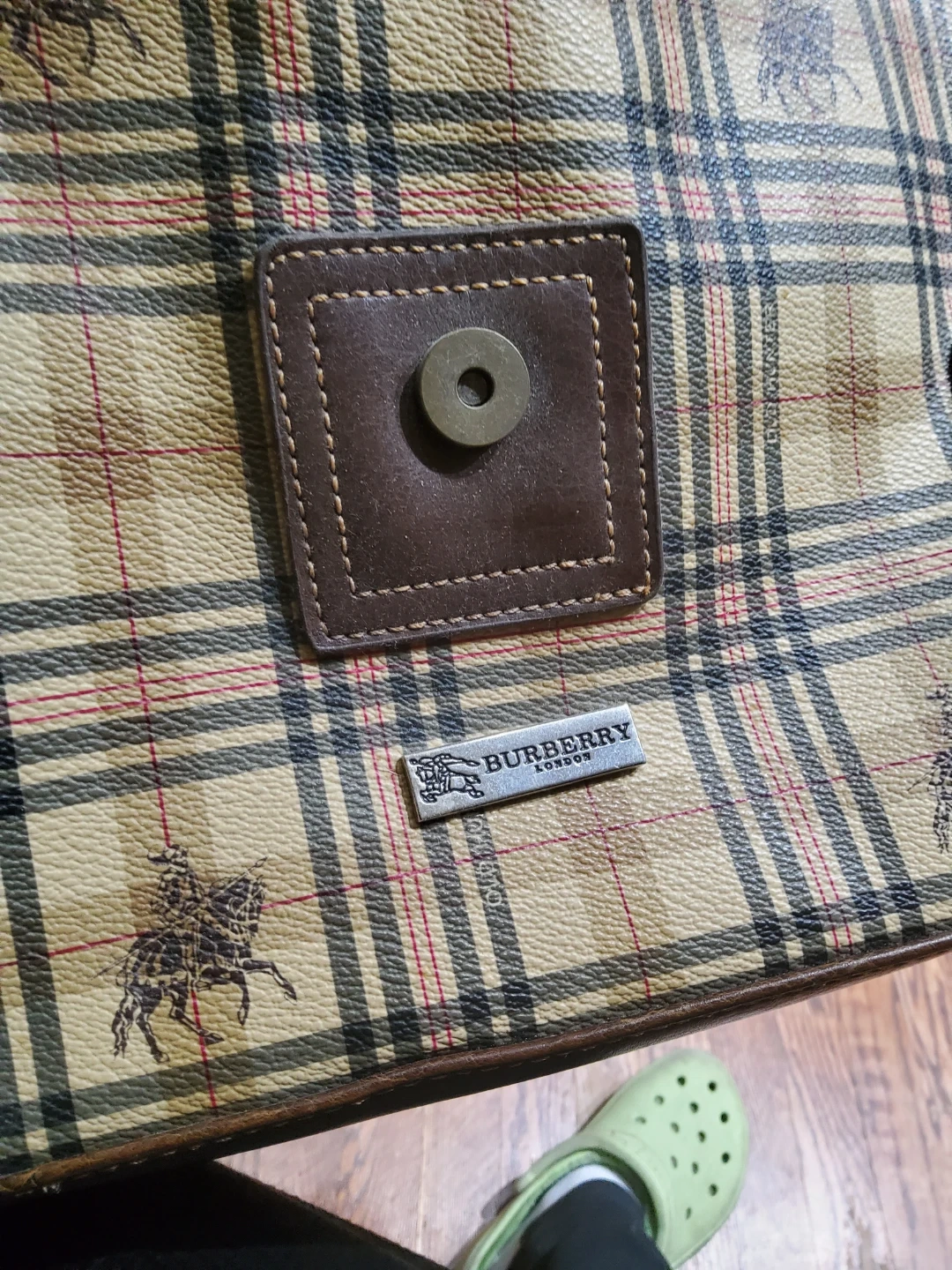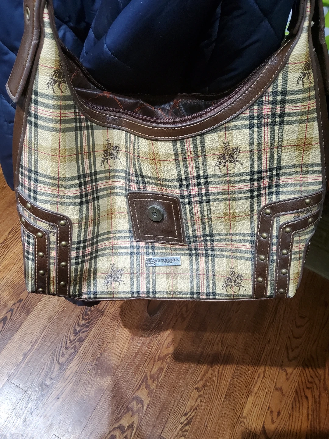 Selling a Burberry London shoulder bag in a classic plaid pattern! It features a brown leather trim and the iconic Burberry knight logo. The interior is lined with a patterned fabric. Great for everyday use!