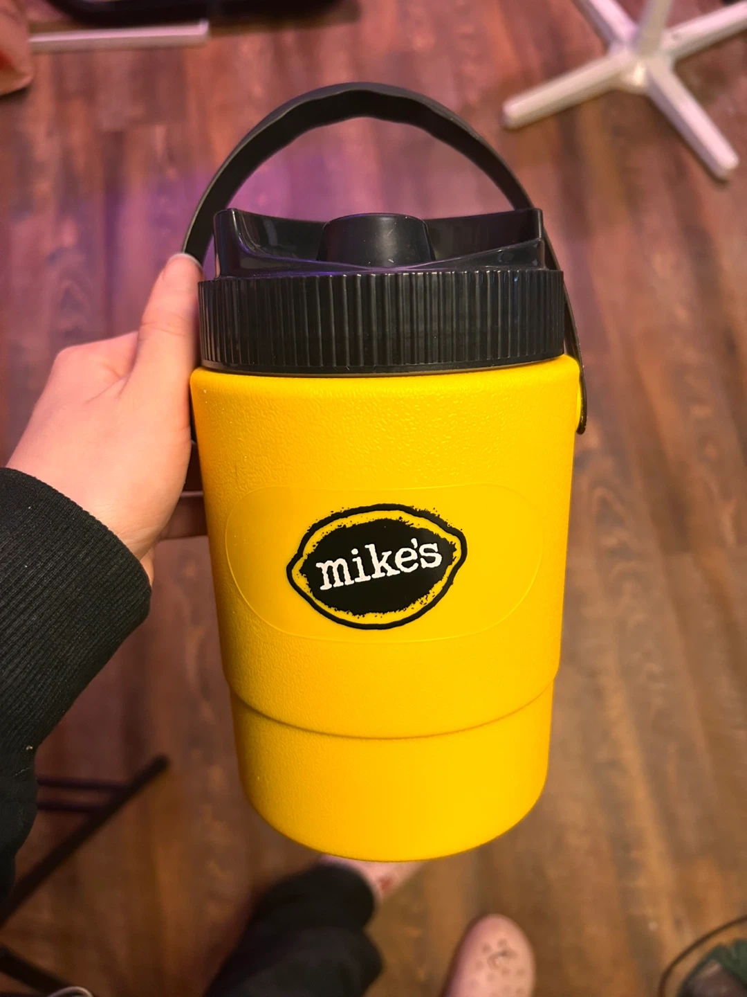 Selling a bright yellow water jug with the Mike's Hard Lemonade logo. Perfect for keeping your drinks cold on a hot day! 1L