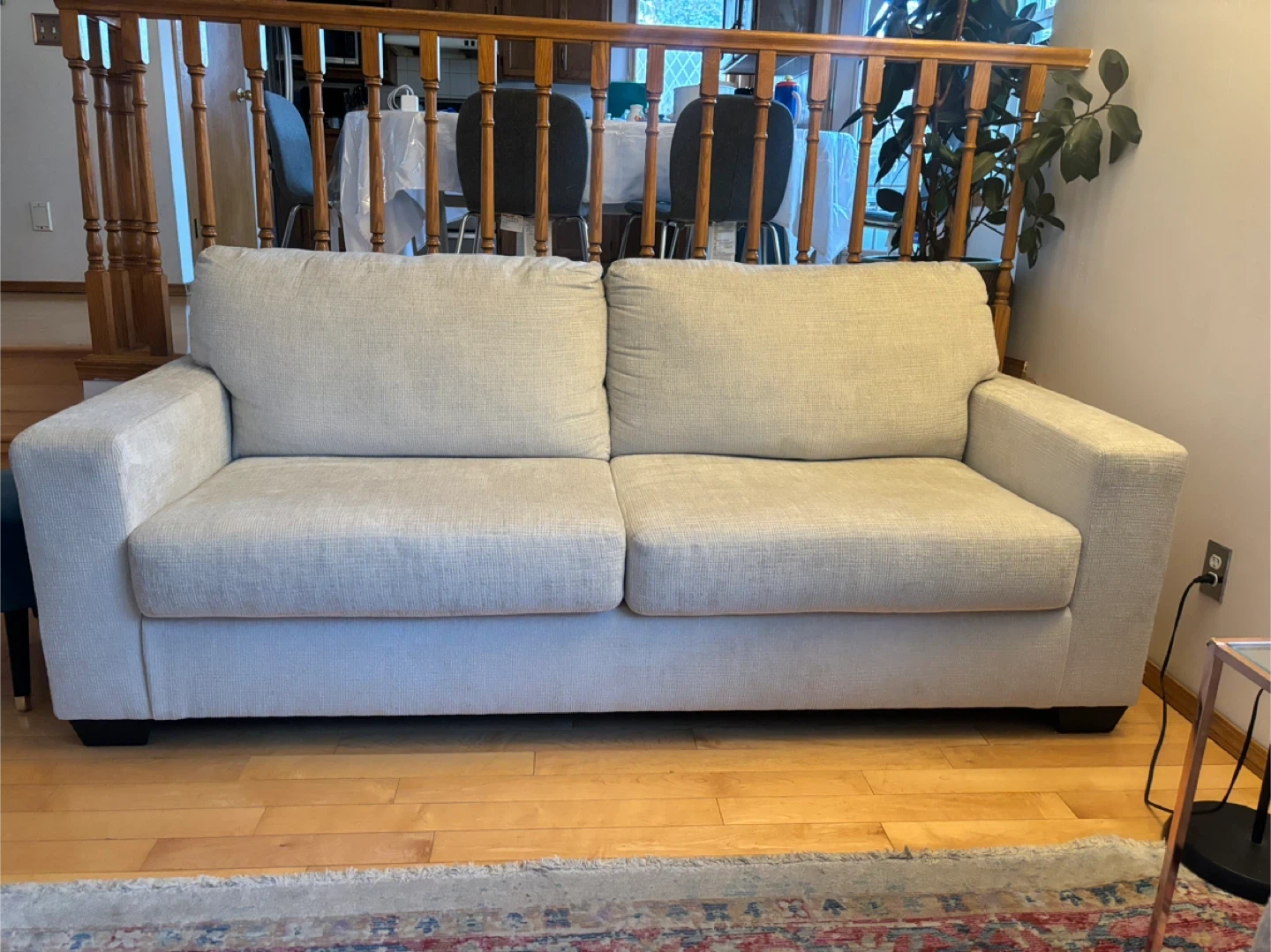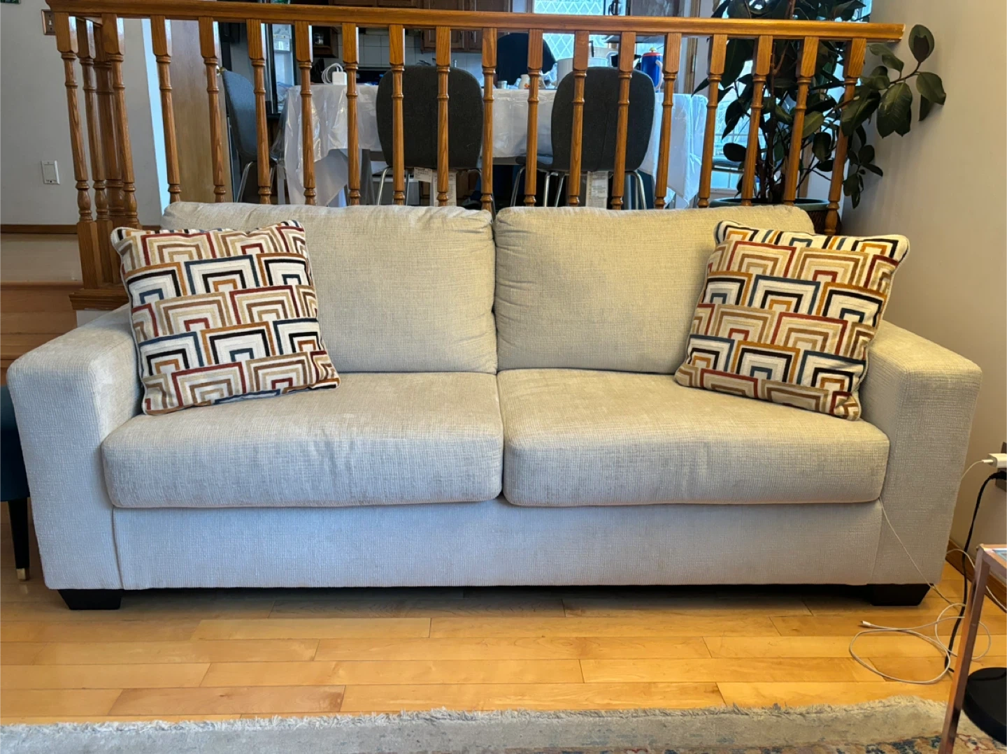Selling a comfy beige sofa that's in great shape! It comes with two decorative throw pillows. This sofa would be a great addition to any living room or den. It's a neutral colour, so it will match any decor! The cushions are soft and supportive, perfect for lounging after a long day