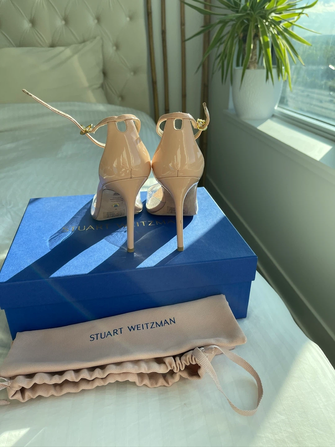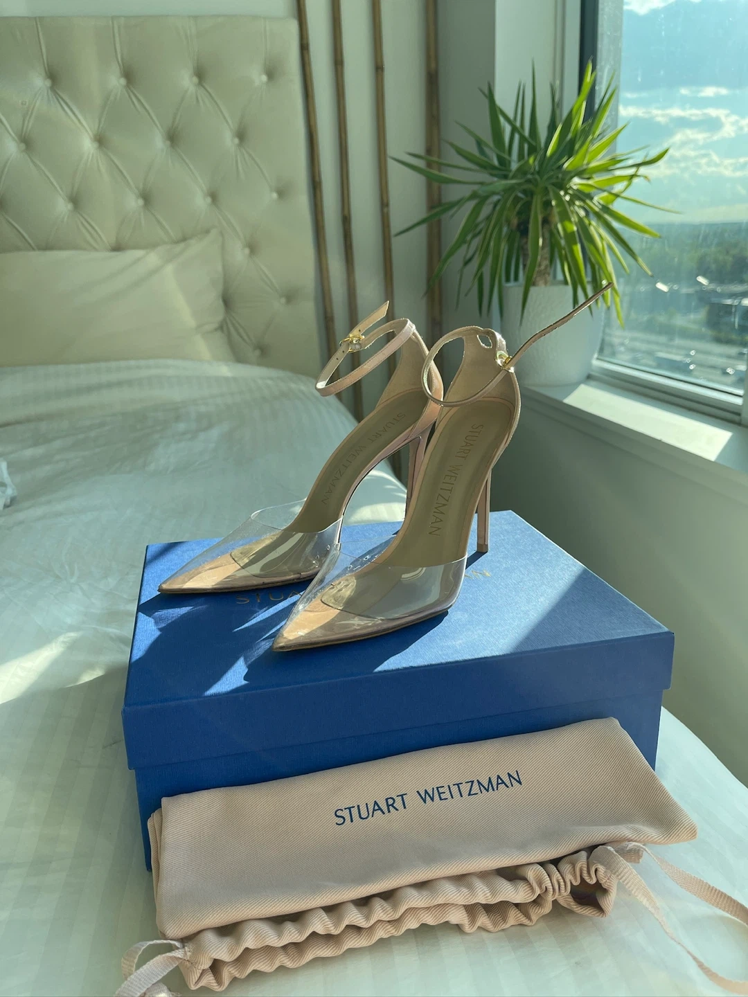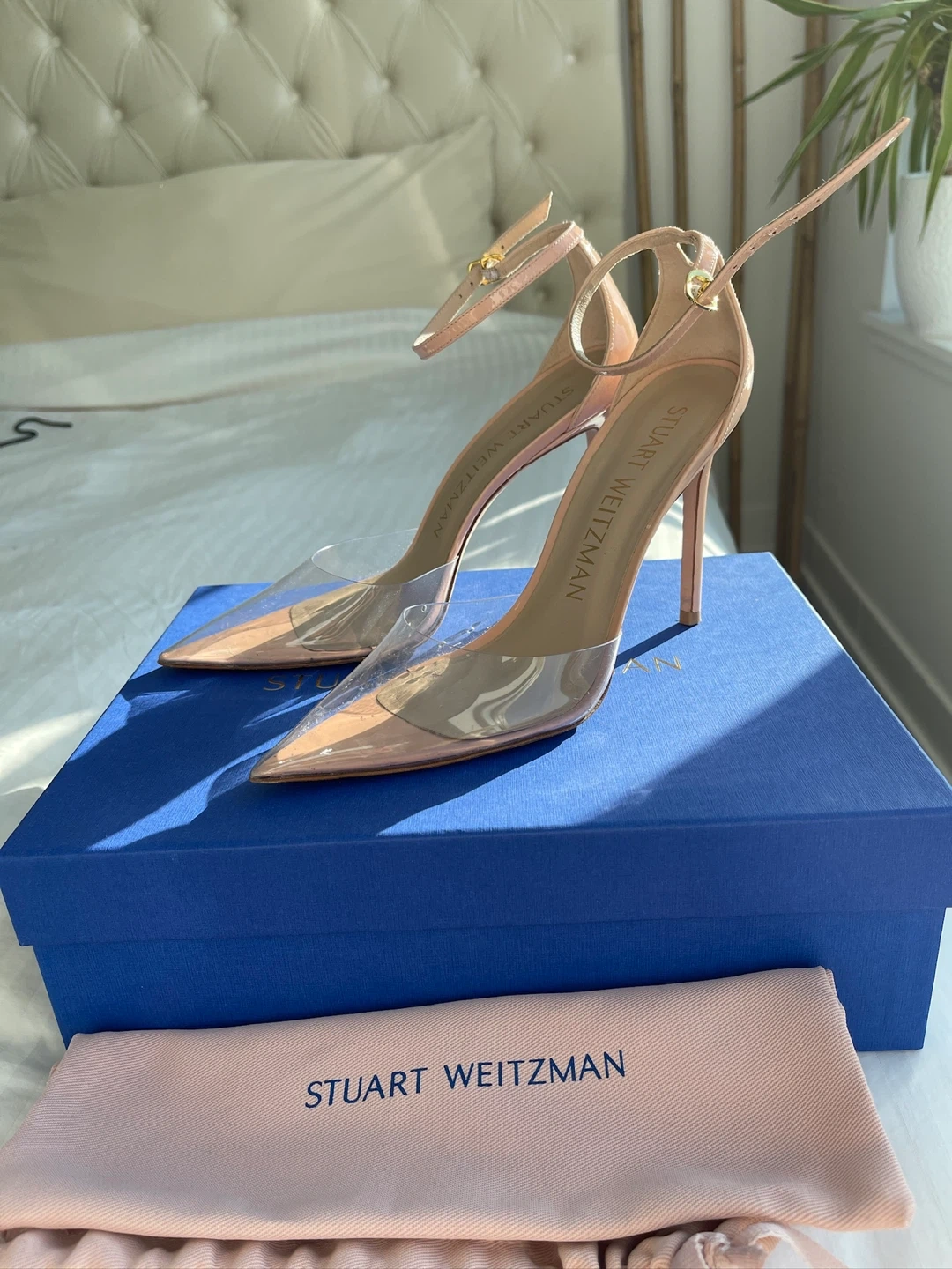 Stuart Weitzman heels are in excellent condition and come with the original box and dust bag! They are a beautiful nude colour with a clear PVC detail. Size 8