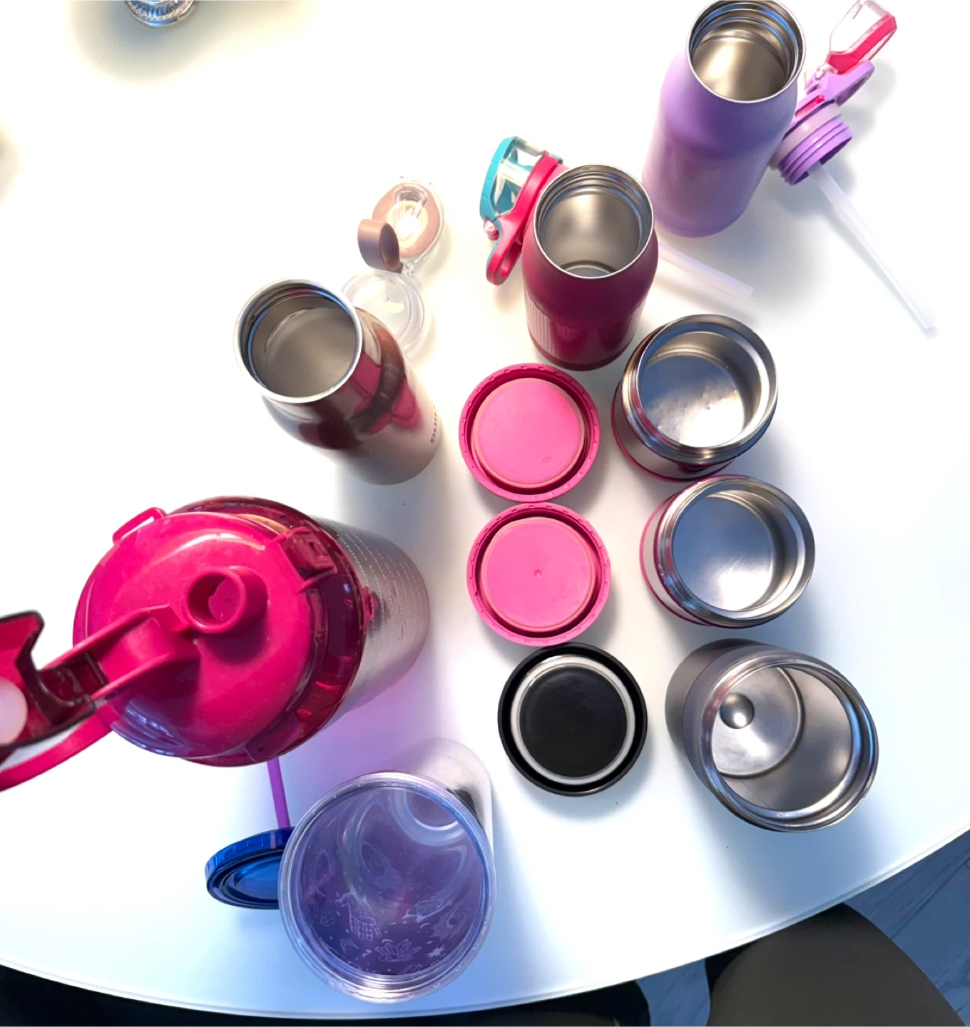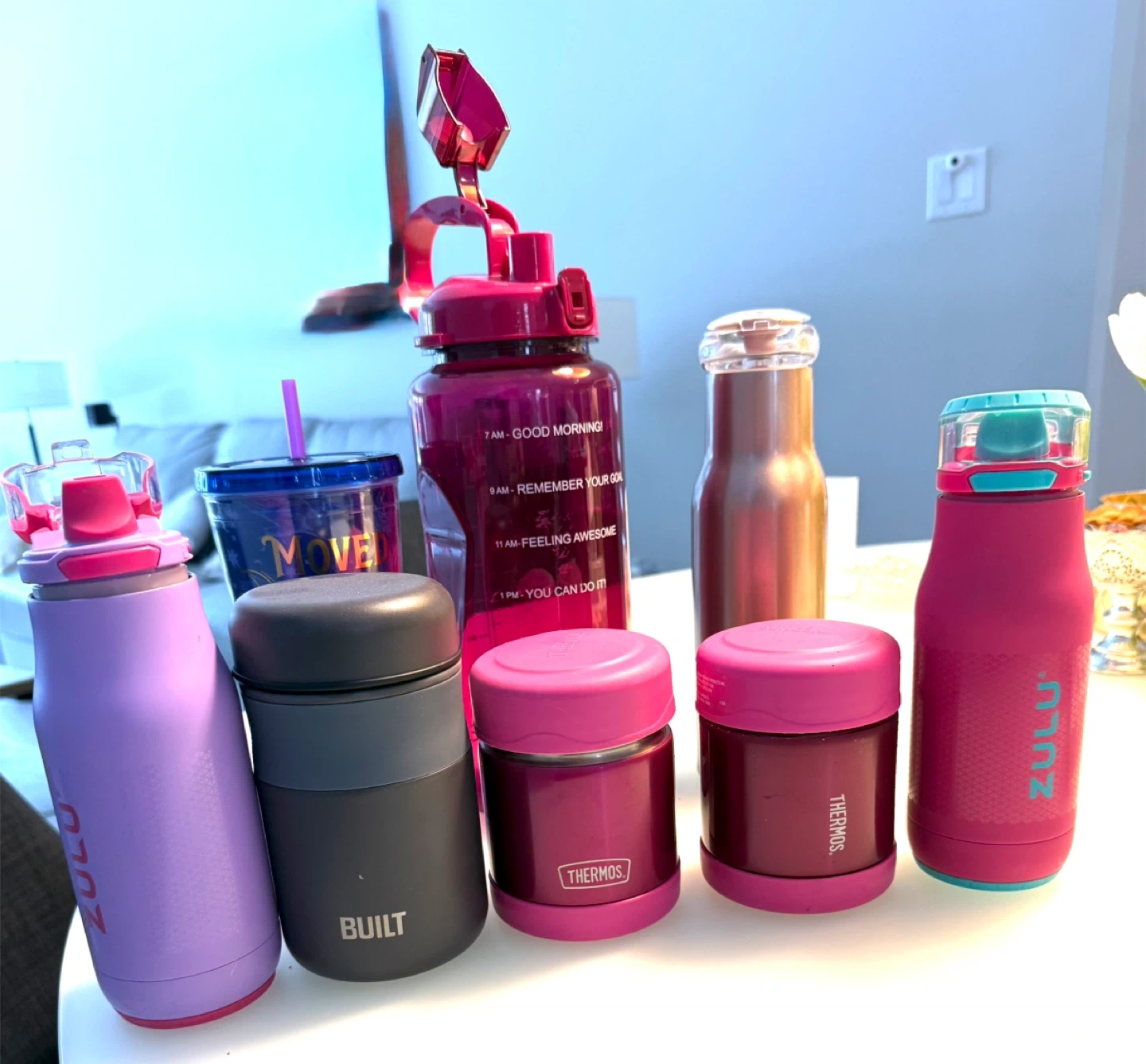 Selling a collection of kids' water bottles and food containers. There are various brands including Zulu, Built, and Thermos. Great for school lunches or outings!
