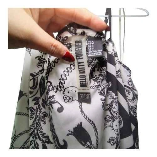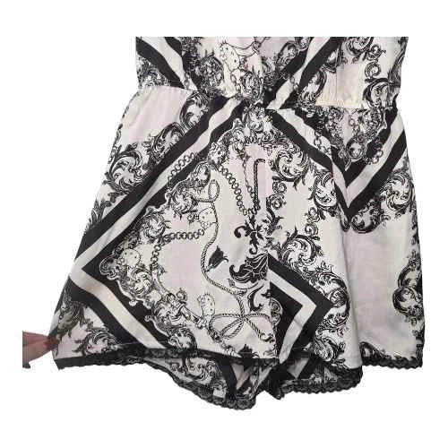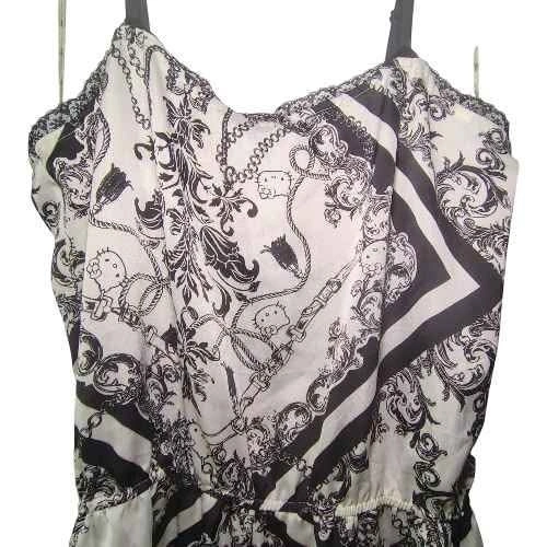 This Hello Kitty lingerie dress is presented in a black and white color scheme, with thin straps and a V-shaped neckline. The romper is crafted from a lightweight material, showcasing a hello kitty and geometric pattern. The design is characterized by a short, flowy silhouette.