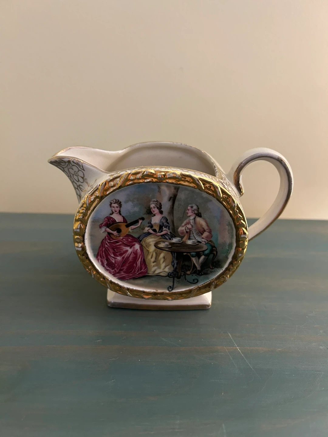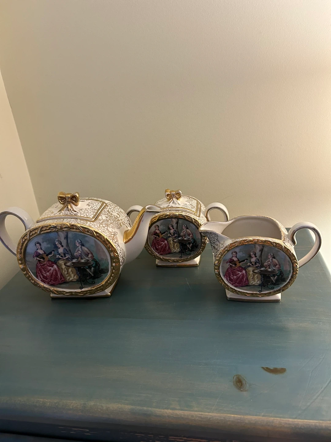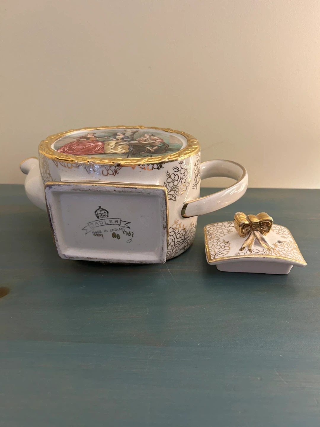 James Sadler Cherub Tea Set 1940’s Barrel Tea Pot, Creamer & Sugar Bowl. Gold accents with English ladies in gowns tied ribbon on handle. There are two small chips in the sugar bowl other wise all pieces are in great condition. Tea Pot 5”high x 9”wide x3/4”deep.