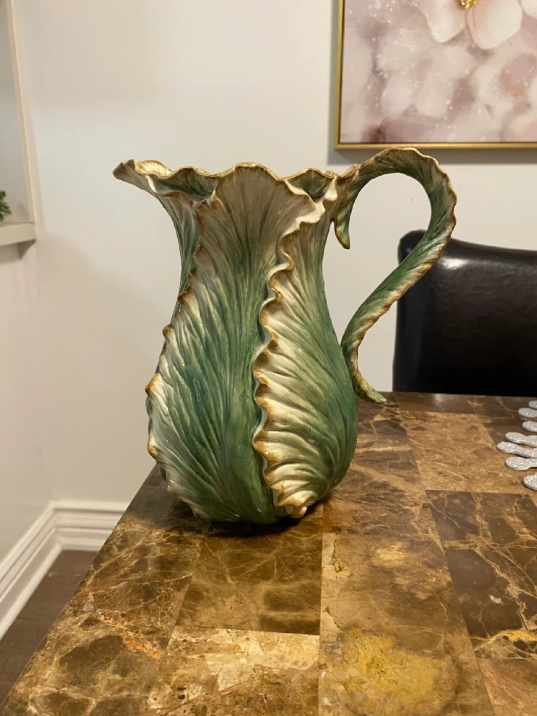 Here's a unique cabbage-shaped pitcher! It's perfect for adding a touch of whimsy to your table setting. The pitcher is in great condition and ready to be used for serving your favourite beverages or as a decorative piece