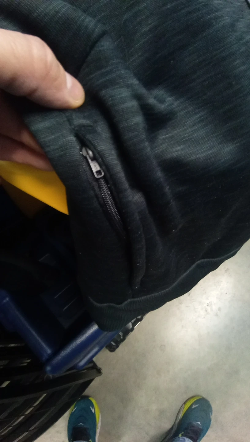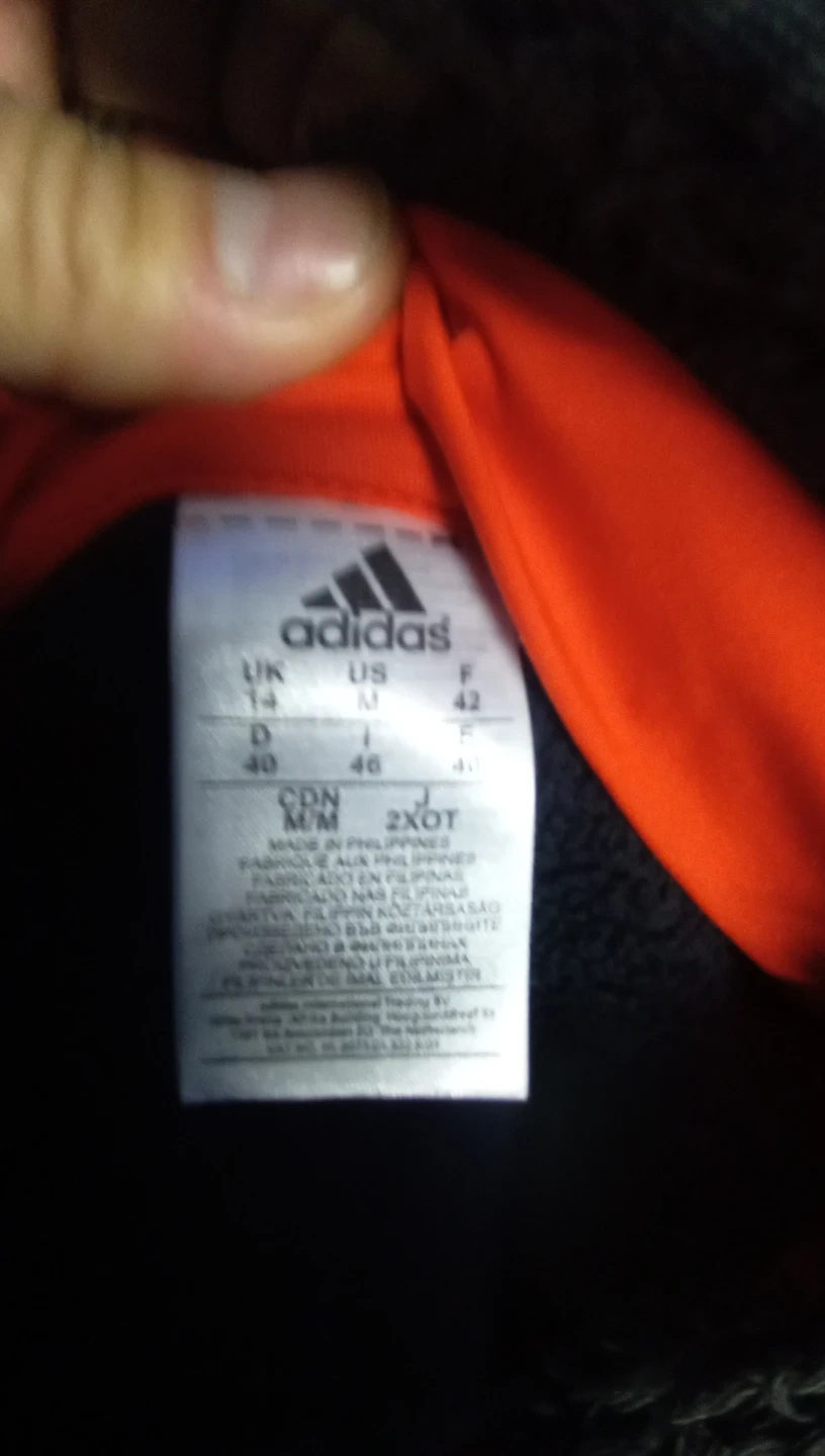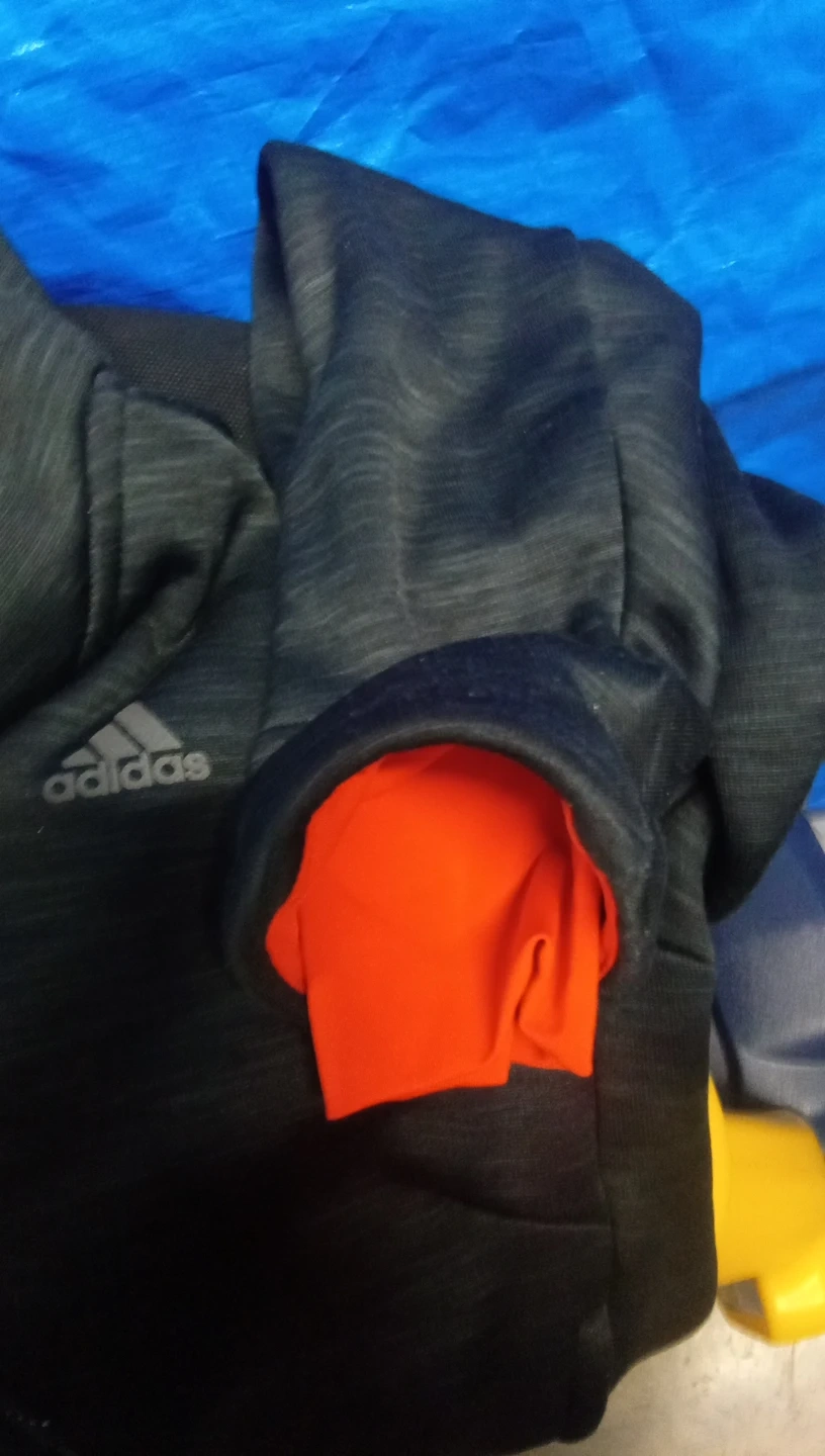 Selling a black Adidas hoodie. It has a gray heathered pattern on the outside and a bright orange lining in the hood. There is a zipper pocket on the side.