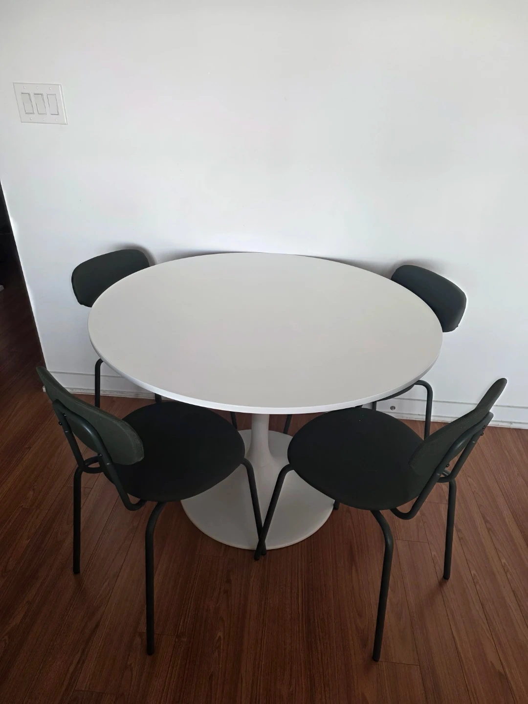 Selling a round dining table with four chairs. The table has a white top and a pedestal base. The chairs are dark green with metal legs. It's a great set for a small dining area or kitchen nook