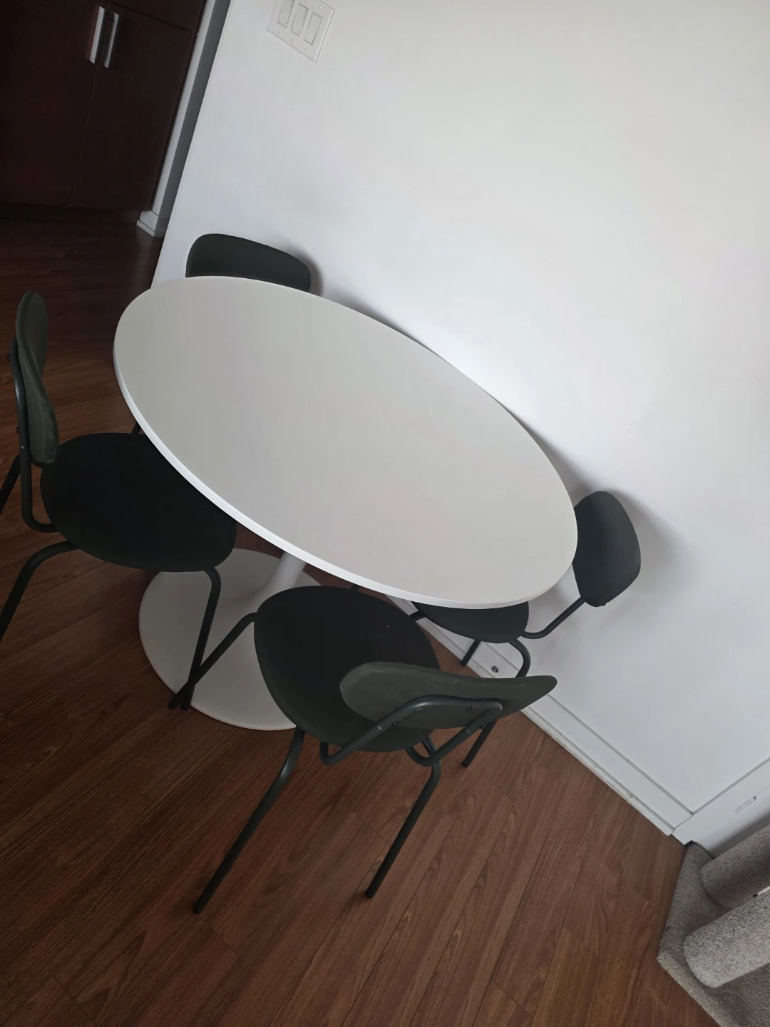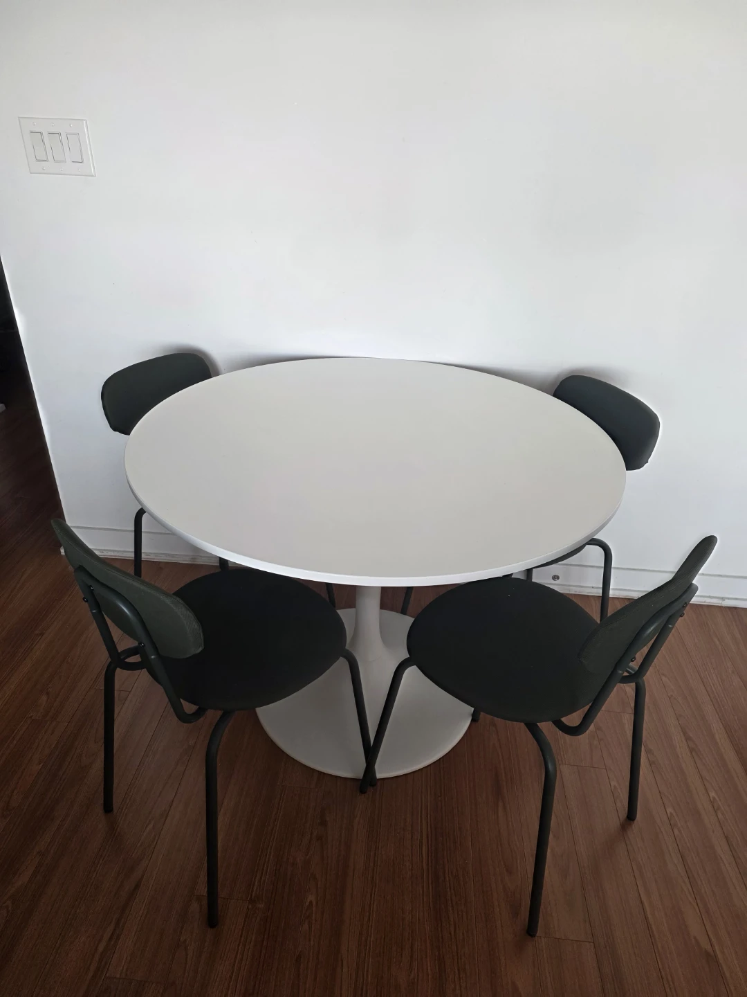 Selling a round dining table with four chairs. The table has a white top and a pedestal base. The chairs are dark green with metal legs. It's a great set for a small dining area or kitchen nook